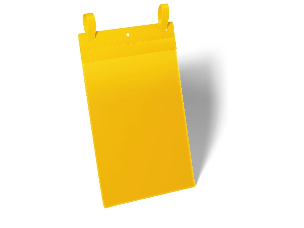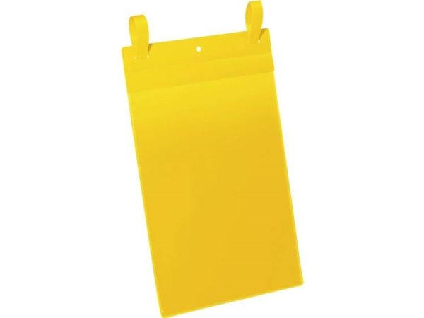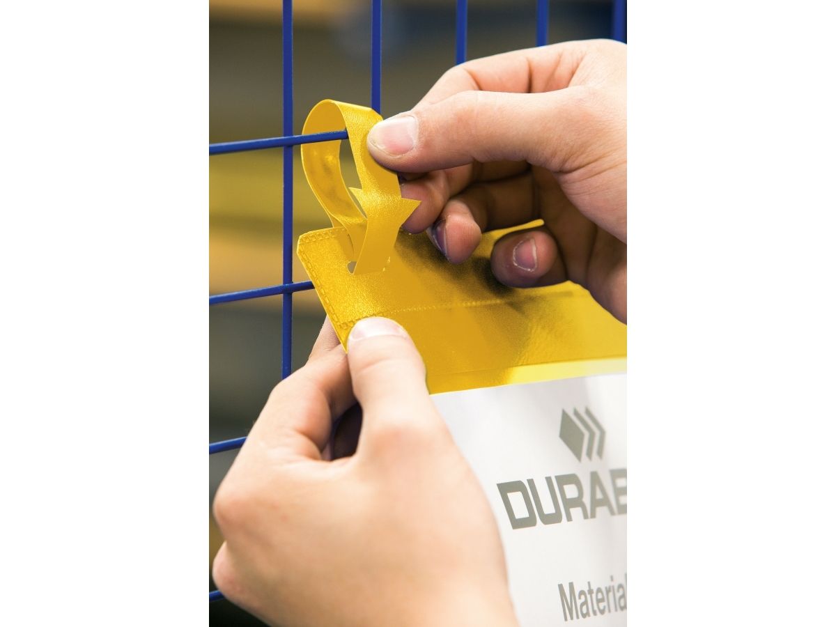 Lagerlomme med pile formede stropper, der fastgøres gennem slidsen i lommen. Ideel til permanent brug på lageret. farvet bagside og gennemsigtigt vindue lavet af heavy-duty polypropylen. Velegnet til udendørs brug takket være åbning med en beskyttende foldefane i toppen der beskytter dokumenter fra støv og fugt. Rivefast og velegnet til scannere. Indhold kan udskiftes hurtigt. Gratis skabeloner til etiketter fås fra www.duraprint.eu. Indvendige mål: A4 høj (B x H) Udvendige mål: 223x530 mm (B x H)
