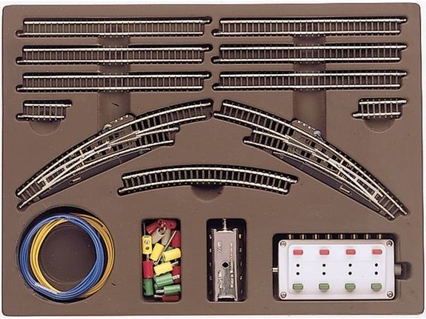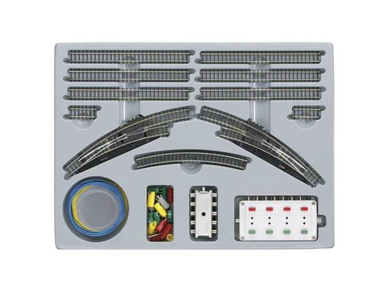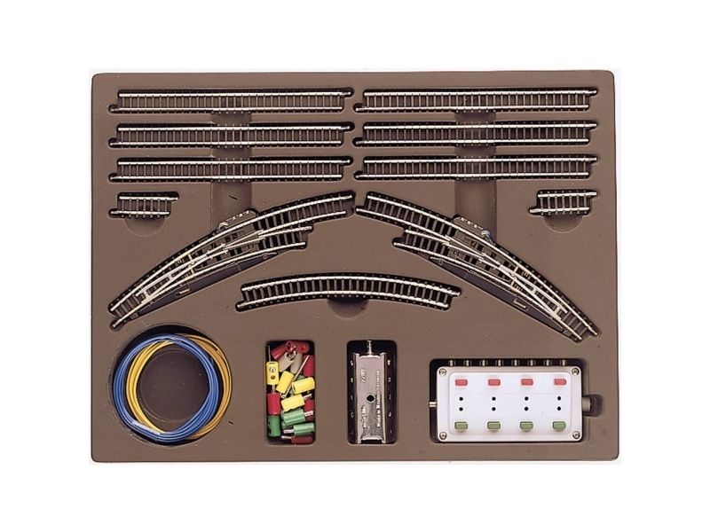 8 lige spor, 2 buede skinner, 2 elektromagnetiske kurvesporskifter, indstillingspult, fordelerplade, tilslutningsmateriale og byggevejledning.