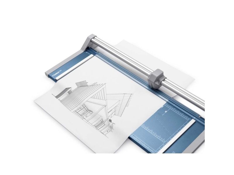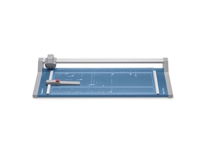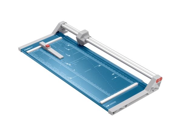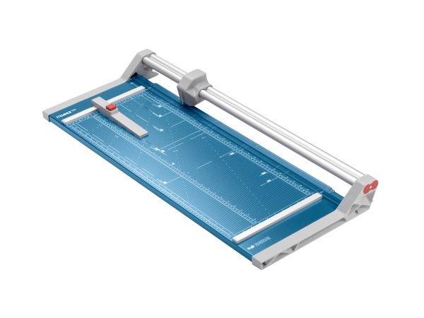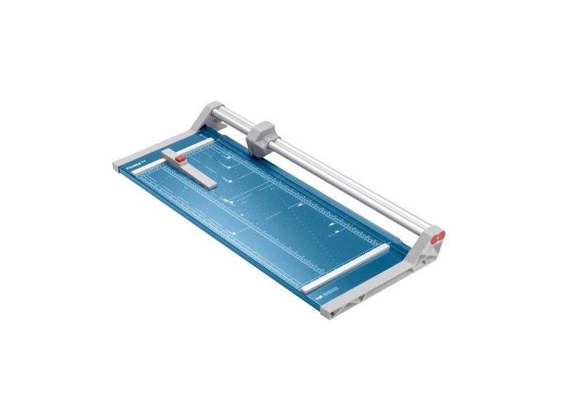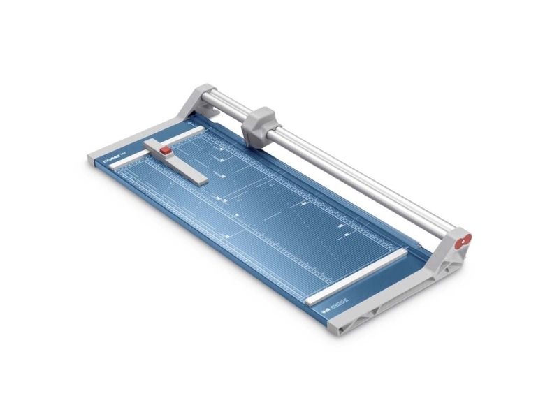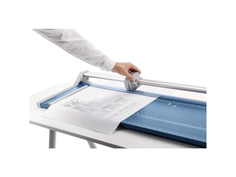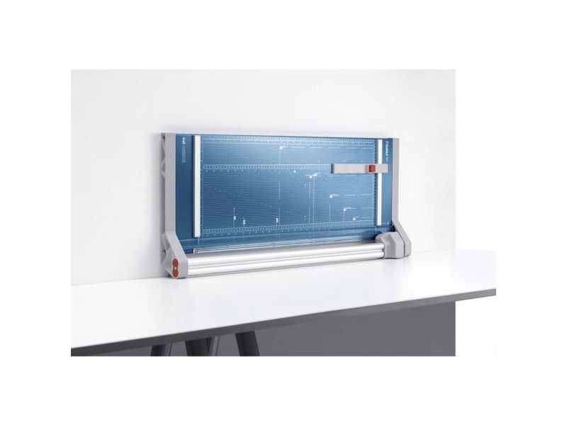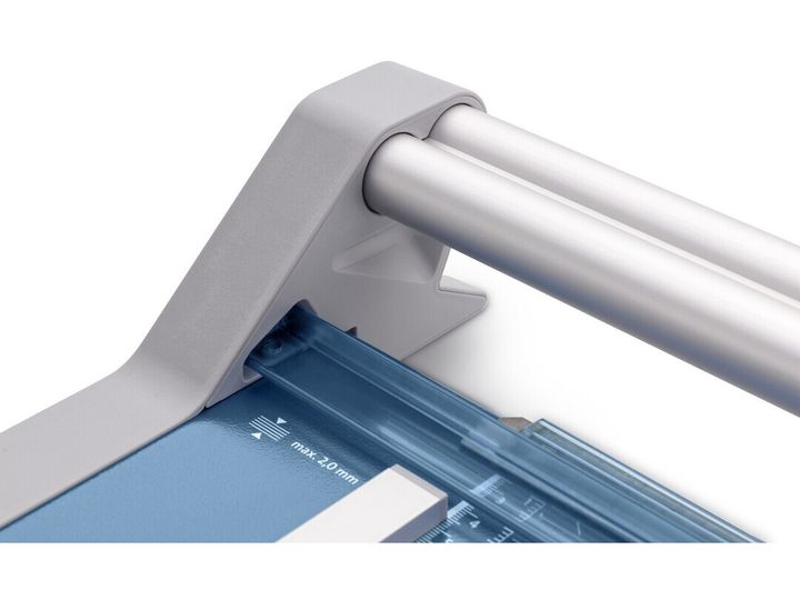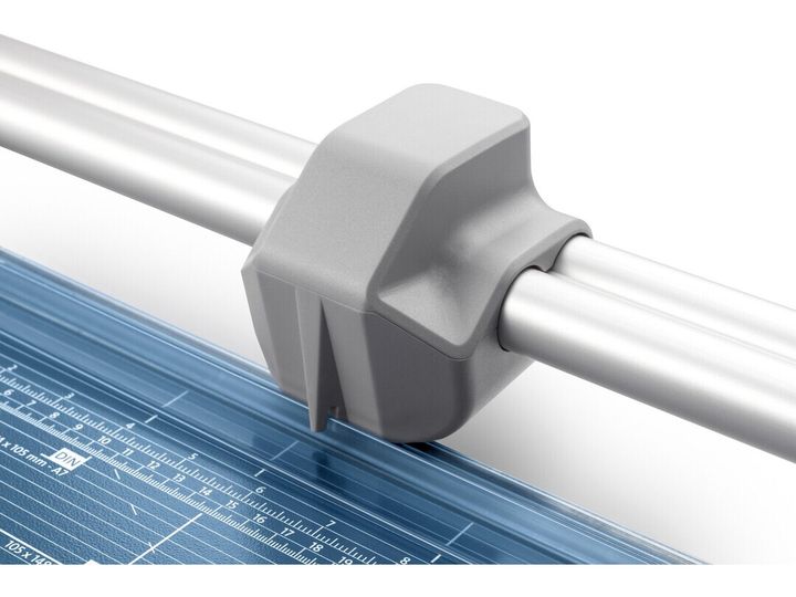 - Helpful format lines on the base with mm division along the cutting edge make aligning the material to be cut even easier - Stable metal base with non-slip rubber feet to keep the rotary trimmer securely in place - Automatic clamping on the cutting line to quickly fix in place the material to be cut - Convenient rotary trimmer for professional use - Double guide bar for absolutely accurate cutting - Self-sharpening steel rotary blade enclosed in safety cutting head, ground and hardened - Ground lower blade of hardened steel - Rotary blade in closed, ergonomic plastic head - Two scale bars - Adjustable backstop for quickly finding the right format - Rear feet for space-saving upright storage - High-quality blade made from hardened steel for long-lasting cutting quality