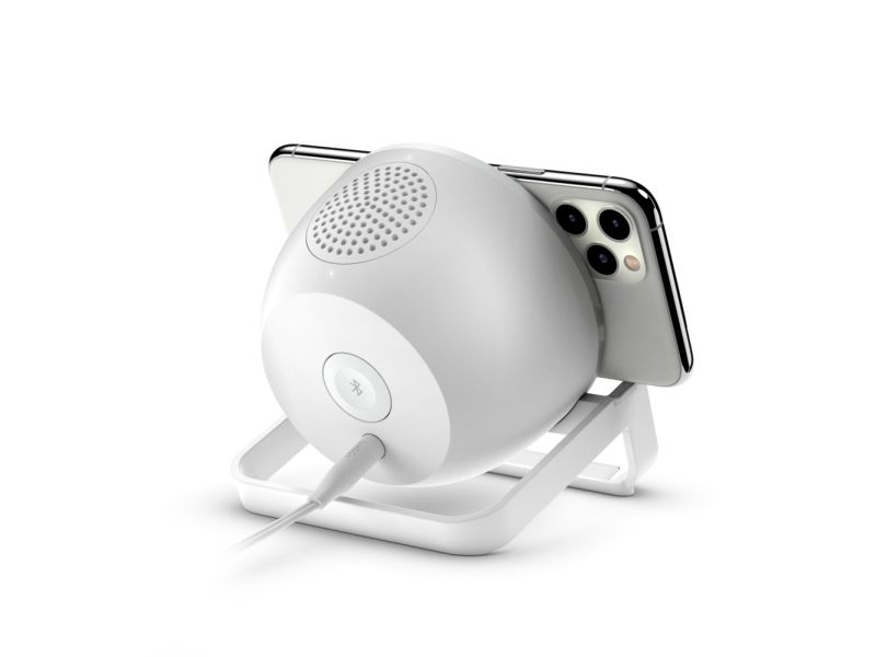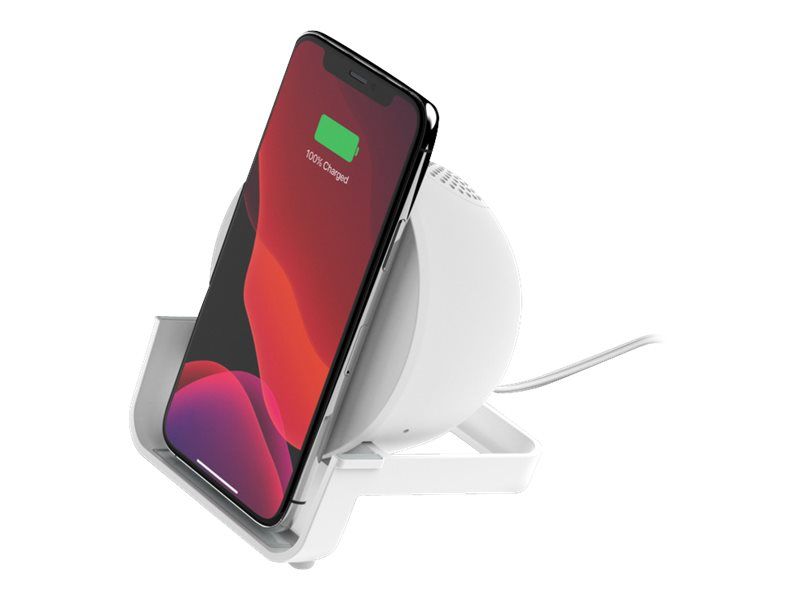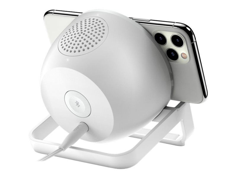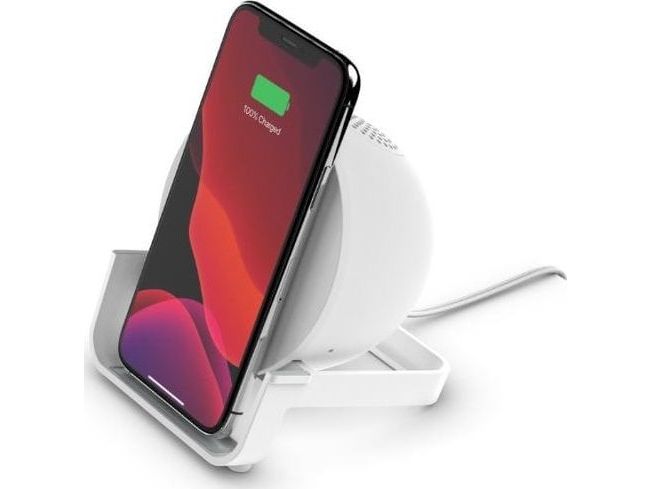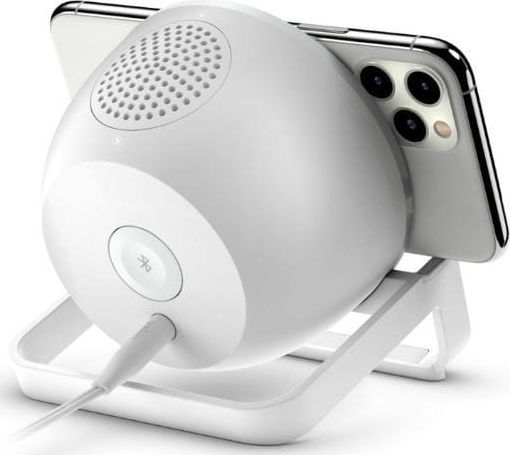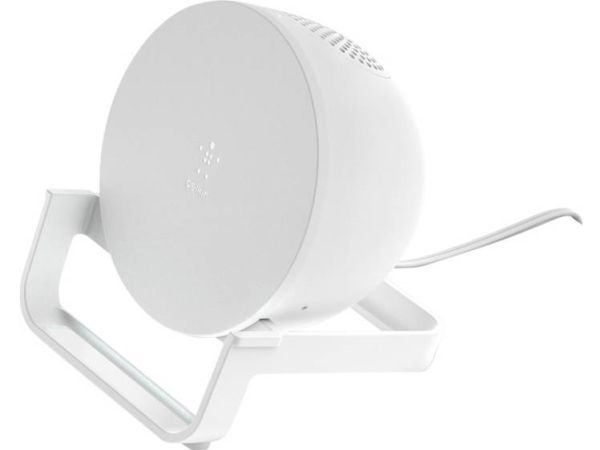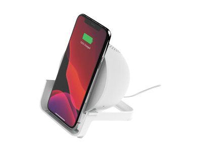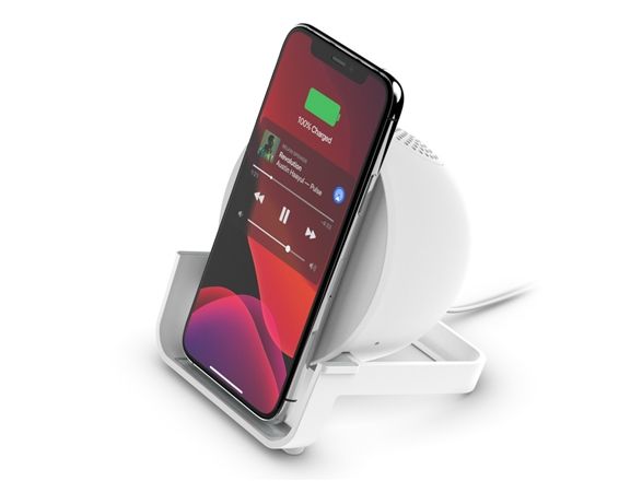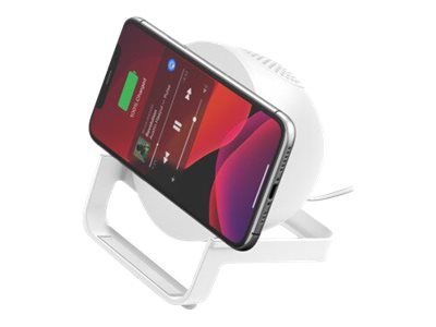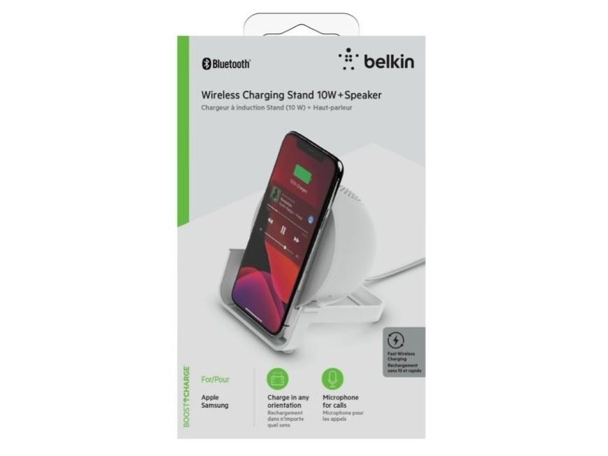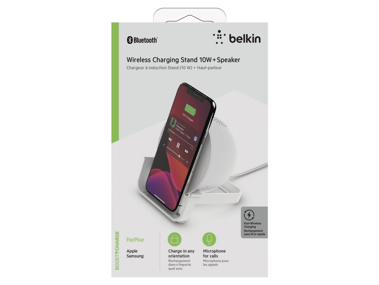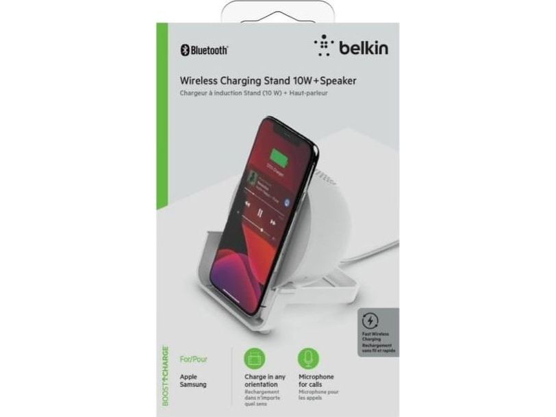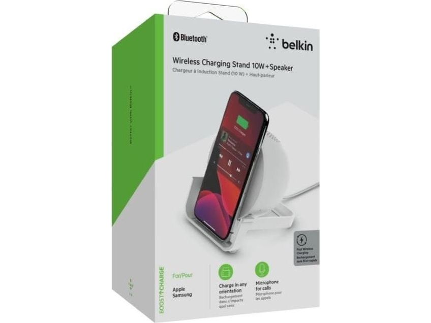 The Belkin BOOST CHARGE Wireless Charging Stand + Speaker is a compact, all-in-one solution for charging and entertainment. It is a 10W Qi -compatible wireless charger with an embedded Bluetooth speaker which allows you to dock and charge your phones in portrait or landscape mode while listening to music or taking phone calls.