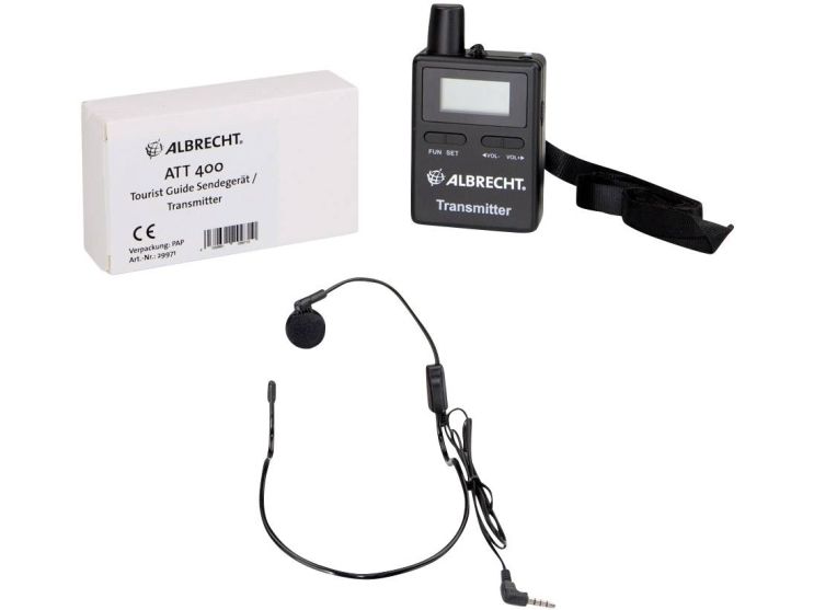 ATT 400 Tourist Guide-rejseleder sendeenhed Lav modtagelighed over for forstyrrelser (50 forskellige grupper kan konfigureres) Hygiejniske hovedtelefoner, der er lette at rengøre Kan anvendes i hele Europa takket være 2.4 GHz ISM bånd Let betjening Op til 200 m rækkevidde Krystalklar lydtransmission Albrecht Tourist Guide-apparater er de ideelle ledsagere og informationsformidlere til turistopgaver, som grupperejser, byføringer, landgange ved krydstogter og meget mere, også i museer og ved fabriksføringer, er sendere og modtagere nyttige til kommunikation mellem ledere og deltagere. ATR400 kommunikationssystemet kan fleksibelt sende apparatet (type. Nr. 29971) og et vilkårligt antal modtagere (art. Nr. 29770).