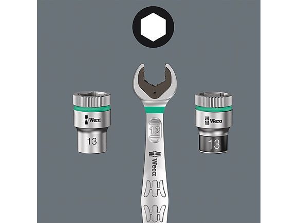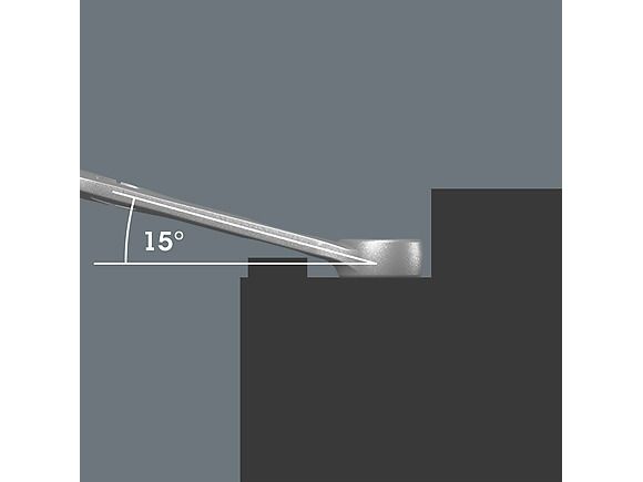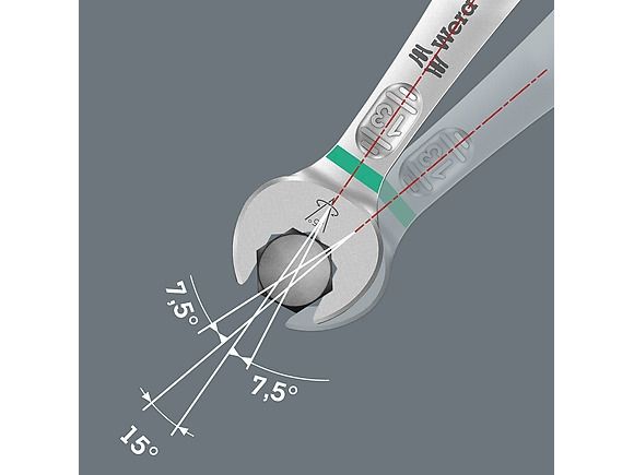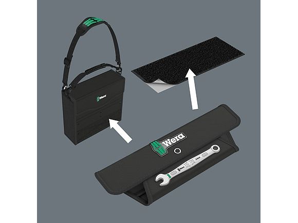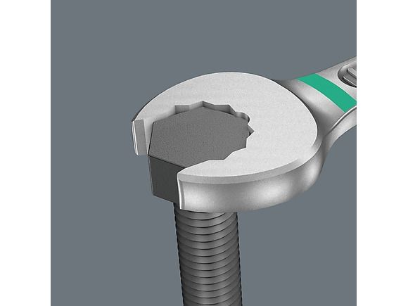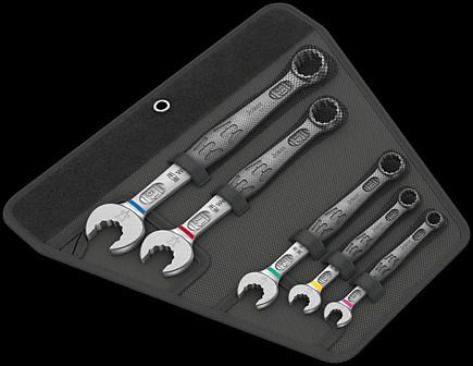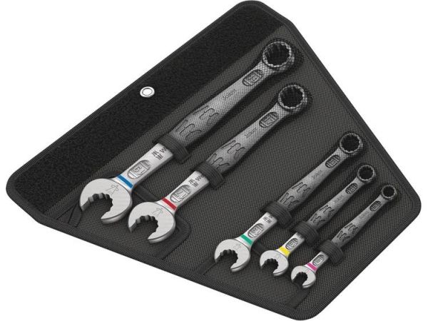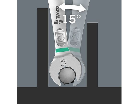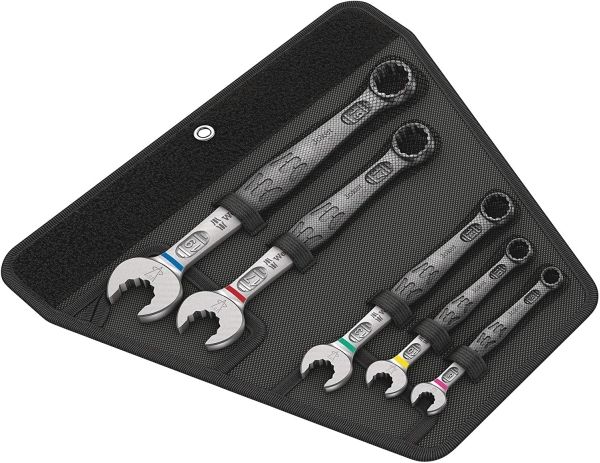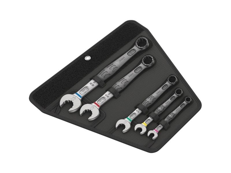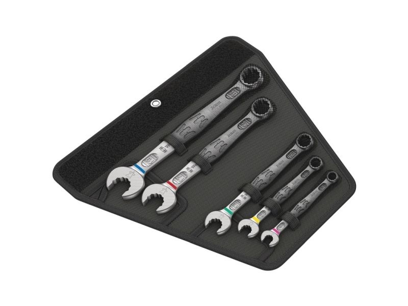 As the installation space becomes increasingly tight during screwdriving, it remains necessary that tools enable users to work successfully. Narrow spaces require additional placement points of the tool, to allow screws to be accessed and actuated. Can spanners be modified so that the placement possibilities of the tool increase? The combination of the 7.5° pivoted mouth and the double hexagon geometry doubles the placement points. A repeated 180° turn of the wrench around the longitudinal axis during screwdriving provides four placement possibilities, and bolts or screw heads can be "taken" every 15°. The Joker 6003 with its smart mouth geometry significantly expands the range of uses in confined spaces. The Joker 6003 will automatically find the respective placement point after every turn. The slim yet robust ring side is angled by 15° to the tool axis. The high-quality surface treatment achieves a high and long-lasting corrosion protection. With Take it easy tool finder: colour coding by size. The Joker pouches are suitable for attachment to walls, shelves, workshop trolleys and the Wera 2go system thanks to the hook and loop fastener system on the back.