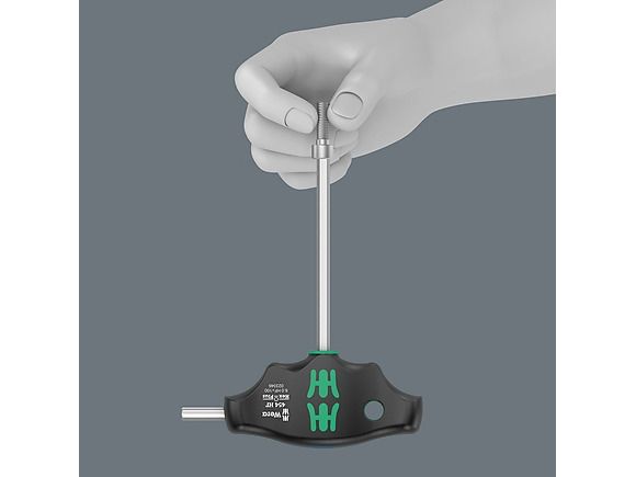 T-handle screwdriver: The ideal handle shape to allow high torque transmission in difficult tightening and loosening situations. The ergonomic shape of the handle fills the palm of the hand well, the fingers lie safely in the soft rounded handle recesses. The whole hand makes contact with the handle and friction losses between the hand and the handle are avoided. With holding function (HF) to securely hold the hexagon socket screw on the tool. Special surface treatment of the blades for high corrosion protection and an optimum fit in the screw head.