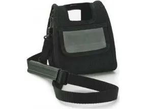 The ZQ210 printer has a soft case option that also allows you to carry the printer using a shoulder strap. Lift up the top flap of the soft case. Insert the printer in the case with the bottom of the printer facing forward in this orientation. Turn the case around to access the LCD display and user controls which are visible through the plastic window. The bottom half of the plastic window can be lifted to access the paper path.
