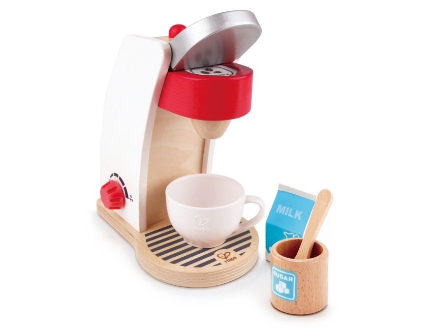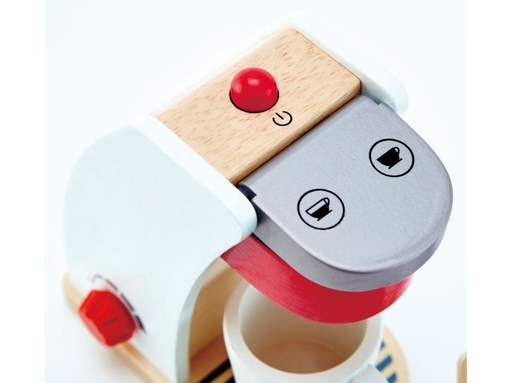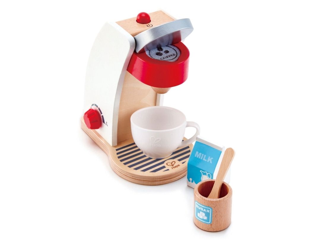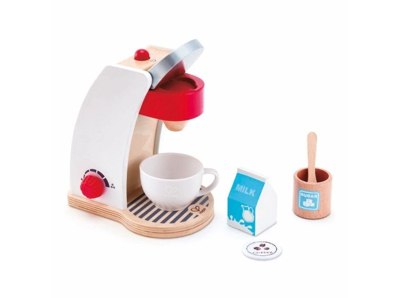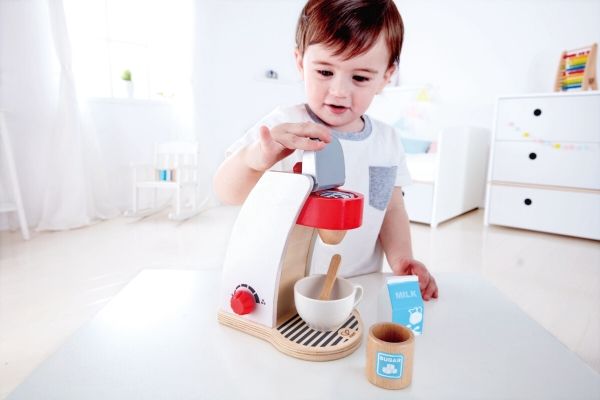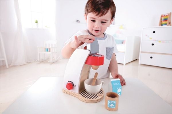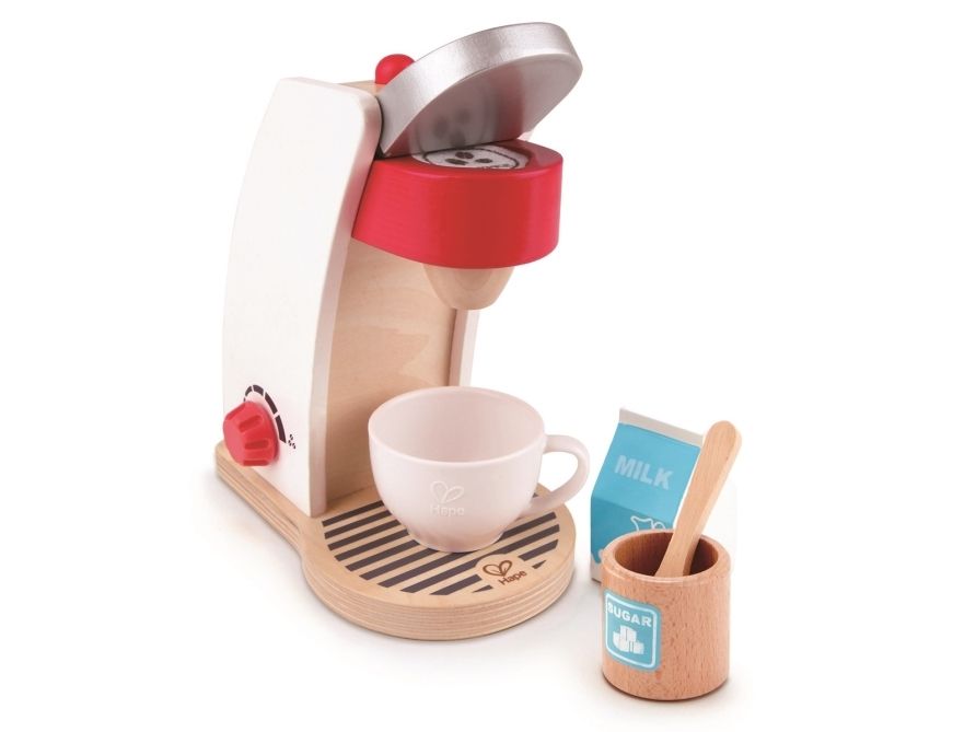 Børn kan lave en kop kaffe til dem selv, eller til at servere for en gæst, med denne moderne kaffemaskine, hvortil der er sukker og fløde.