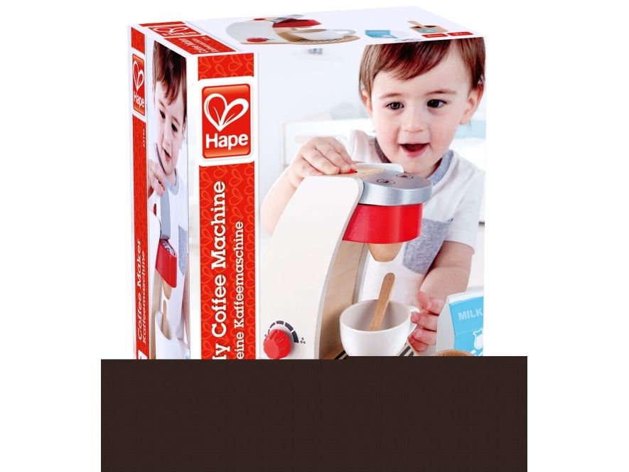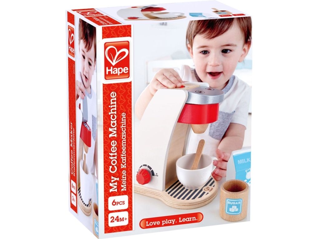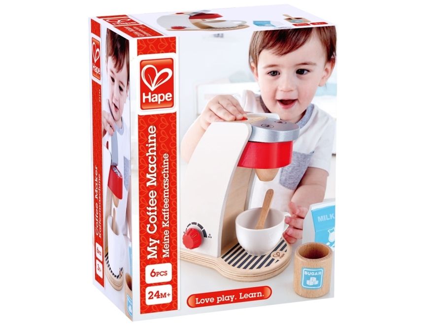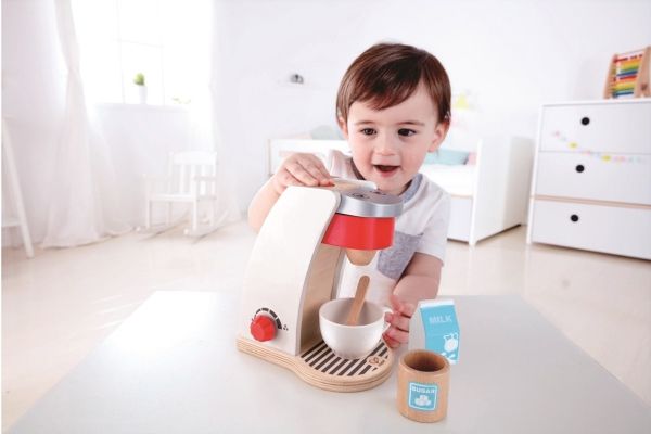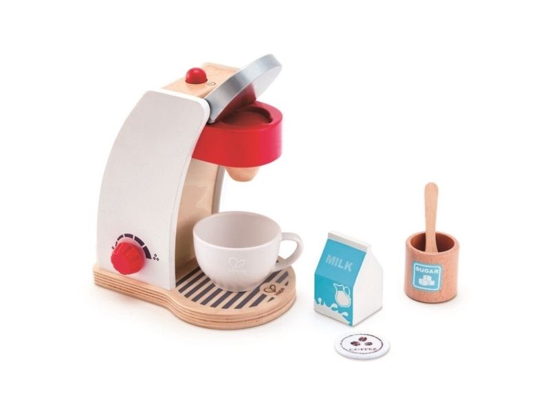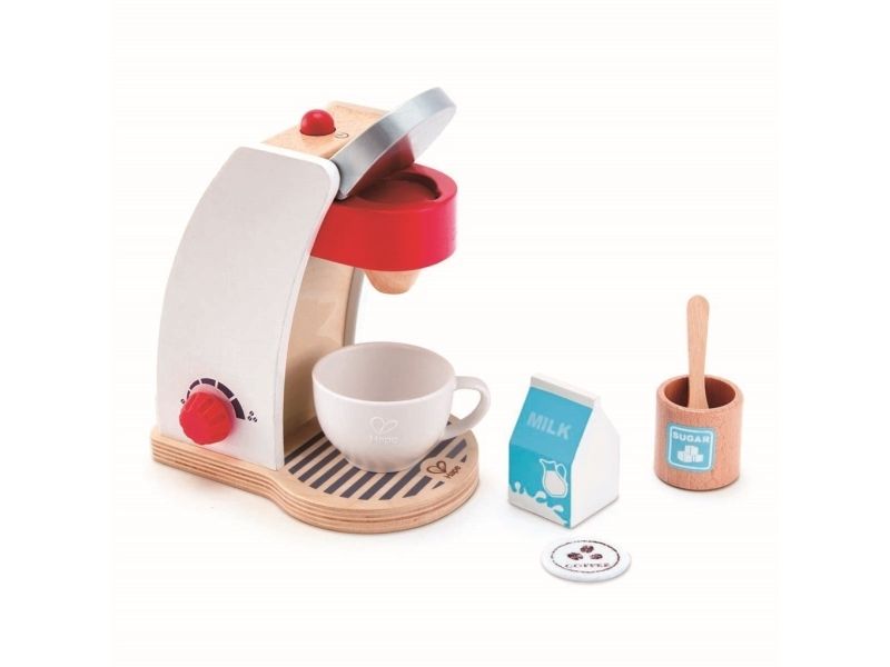 Børn kan lave en kop kaffe til dem selv, eller til at servere for en gæst, med denne moderne kaffemaskine, hvortil der er sukker og fløde.