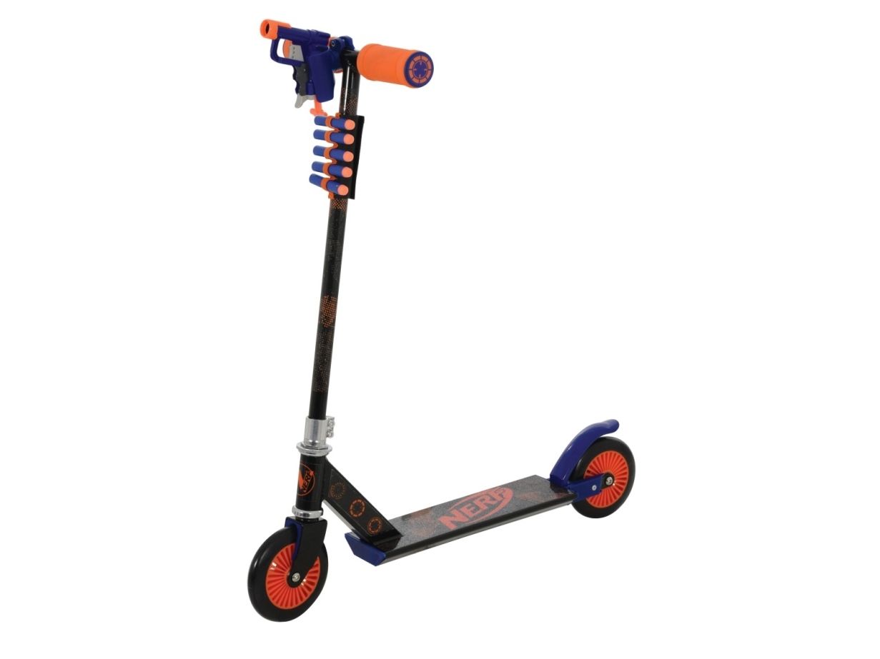 Det er Nerf eller intet! Ideel til ældre kørere, der har mestret 3 hjul. Løbehjulet leveres komplet med styret monteret Nerf blaster og 5 pile i et køligt hylster. Med farve antislip griptape, reaktivt bagbremse bagpå, PVC-hjul og sej grafik inklusive et fuldt trykt stempelomslag. Maksimal brugervægt 50 kg. Blaster og pile må ikke bruges under ridning