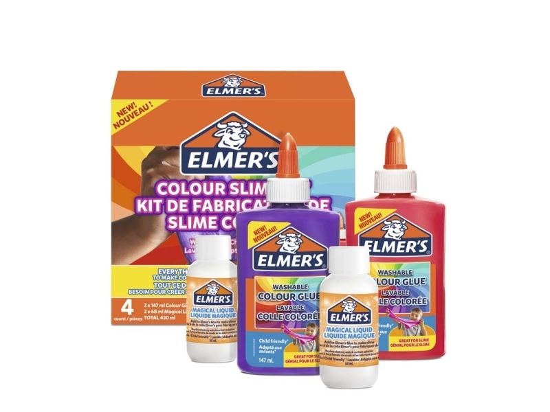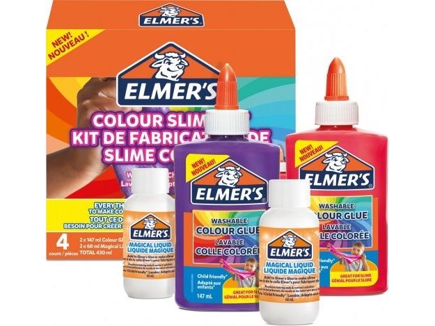 Dette komplette sæt indeholder 1 flaske vaskbar, farvet hobbylim i lyserød og lilla samt 2 flasker Elmer's Magical Liquid, en slimaktivatoropløsning, der erstatter kontaktlinsevæske og bagepulver.