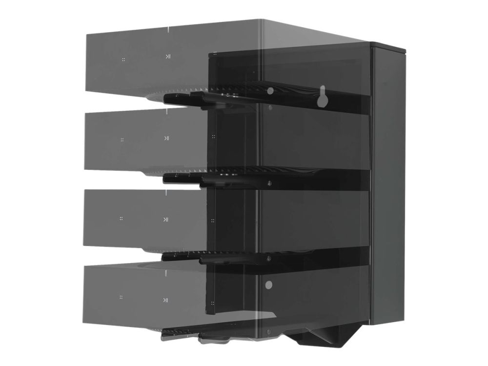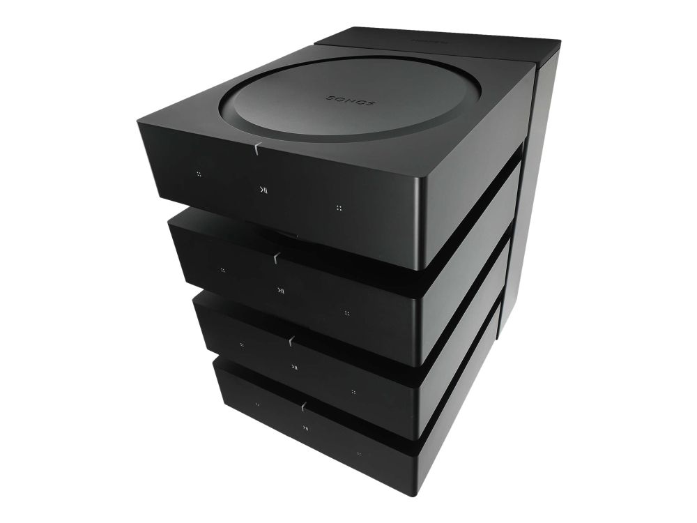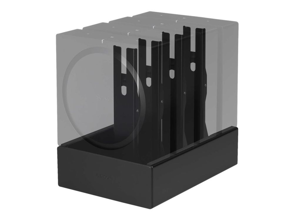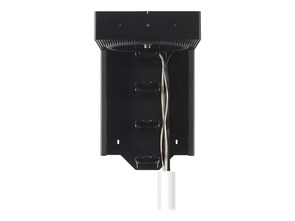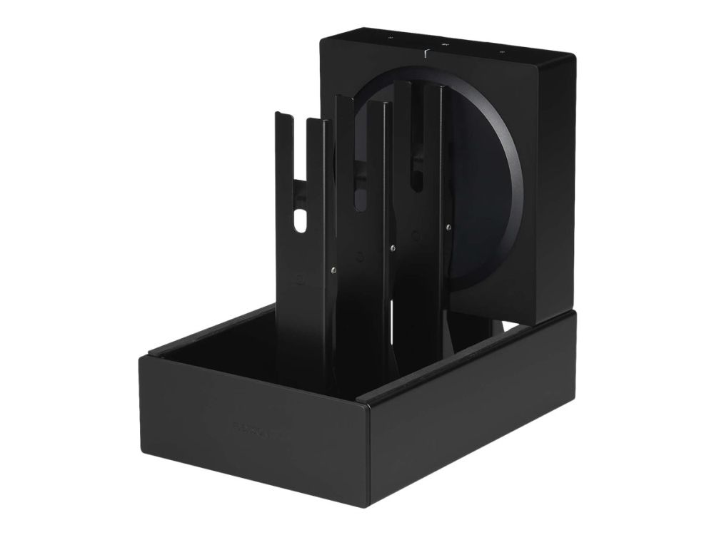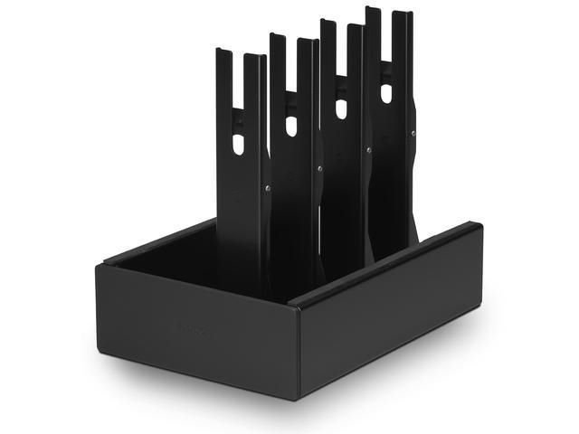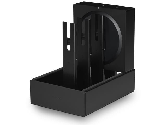 The Flexson Dock holds up to four Sonos Amps, keeping your install looking compact and tidy. Once the unit is fitted to a wall or cabinet the four Sonos Amps simply slide in. The Sonos Amps then click into place and are held securely in position via clever retaining clips. These clips will allow the unit to be mounted underneath a cabinet if required. There is also enough space inside the Dock to neatly run cables from all four units. The robust steel construction is colour matched to the Sonos Amp.