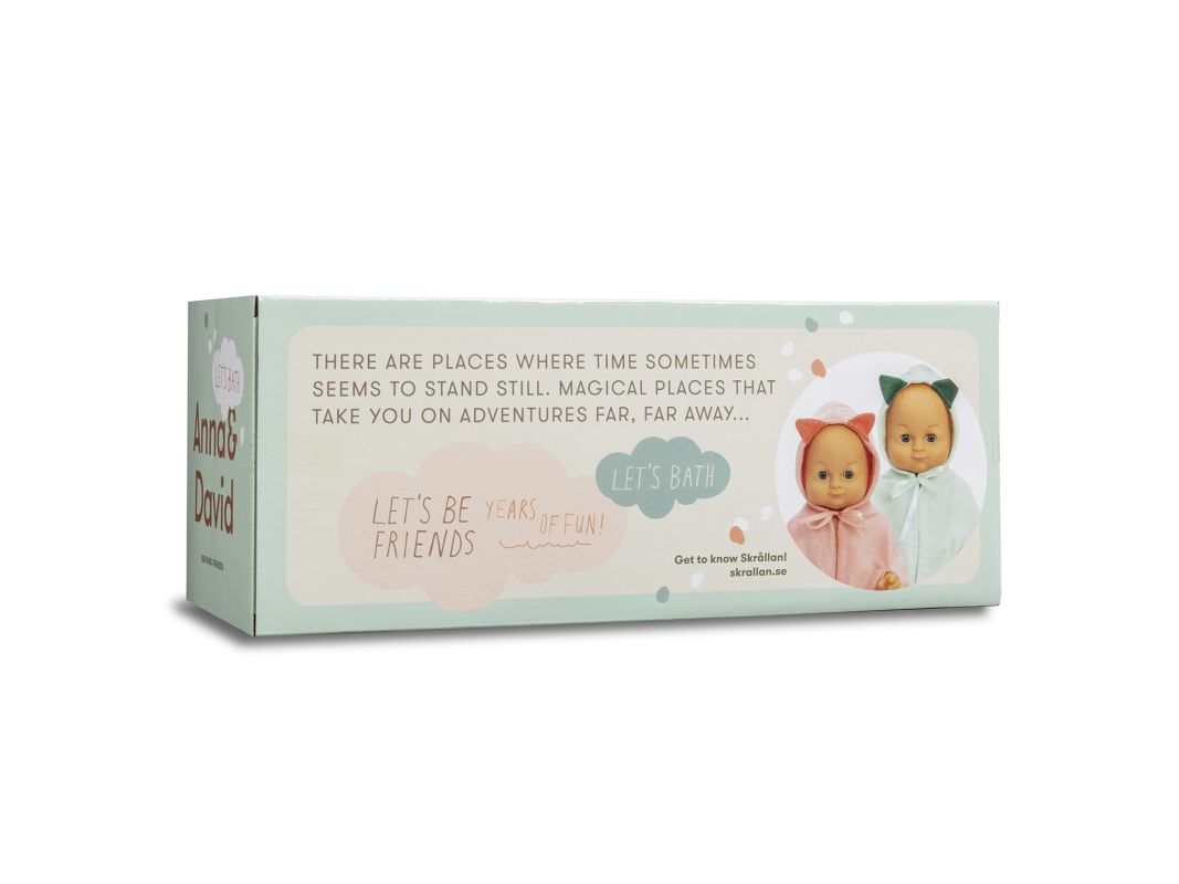 Bad og plask med David! Den populære badedukken David elsker vann! Ta av den myke badekåpen hans, og bad denne fine babydukken. Dukken David er 36 cm lang og lukker øynene når han legges ned. Og kombiner gjerne med Skrållan dukketilbehør og dukkeklær til dukker på 36 cm. Plasten i dukken er PVC. Inneholder ingen forbudte ftalater eller bisfenol. Oppfyller kravene i leketøysstandarden EN-71 og kjemikalieregelverkene REACH og SVHC.