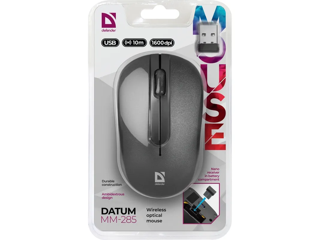 Defender Datum MM-285 - Mus - ergonomisk - optisk - 3 knapper - trådløs - 2.4 GHz - USB trådløs mottaker - svart