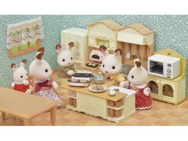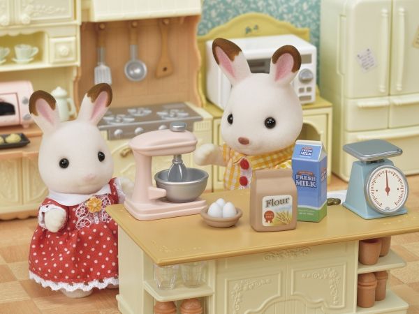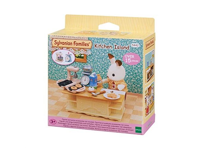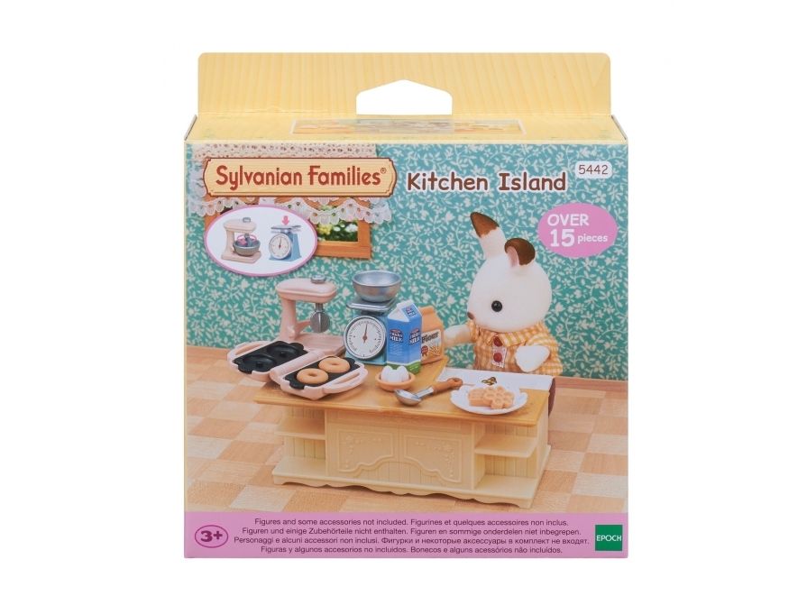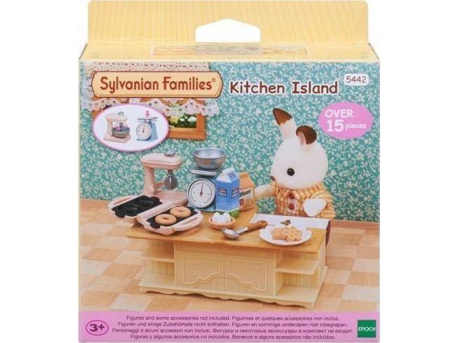Sylvanian Families kjøkkenøyen er et highlight i ethvert dukkehus. Den består av en ca 11 cm stor kjøkkenkrok med benkeplate, mange oppbevaringshyller og en oppvaskkum. Først blir alle ingrediensene veid på kjøkkenvekten, og så blir de rørt til en lekker deig med kjøkkenmaskinen. Med vaffeljernet lages lekre donuts eller vafler. Nam nam! Deilig. Tilbehørssettet inkluderer kjøkkenøyen, et vaffeljern, en kjøkkenvekt og mye annet kjøkkentilbehør. Egnet for barn f.o.m. 3 år.