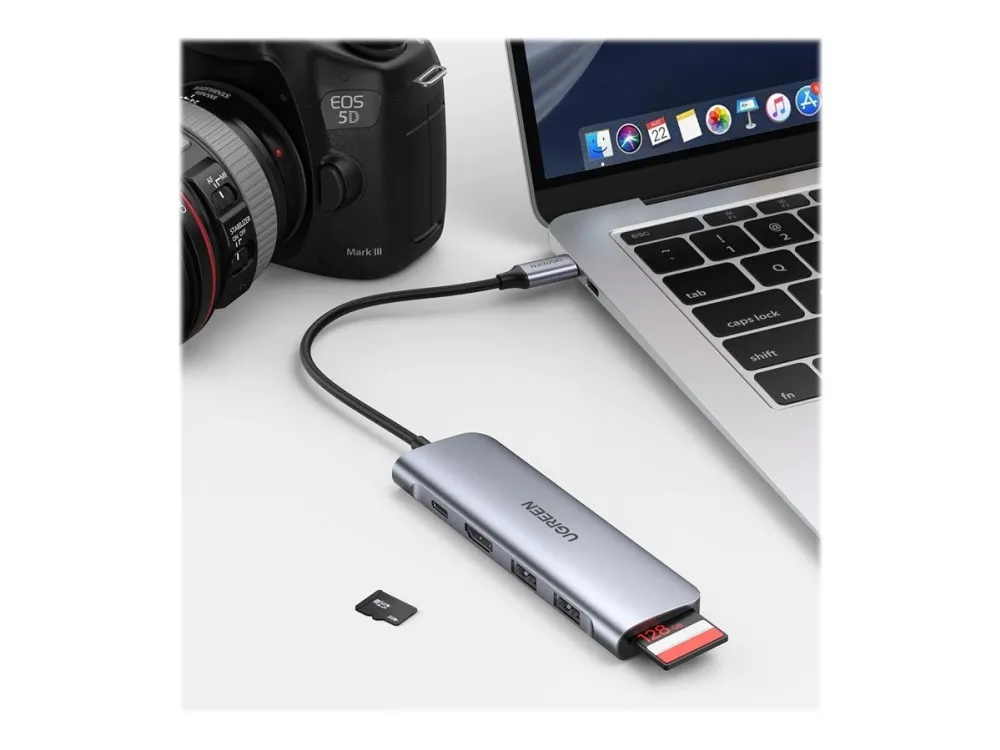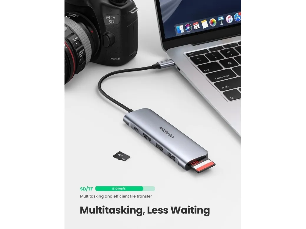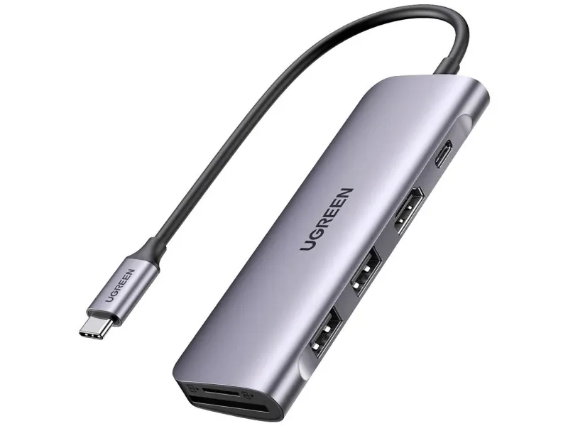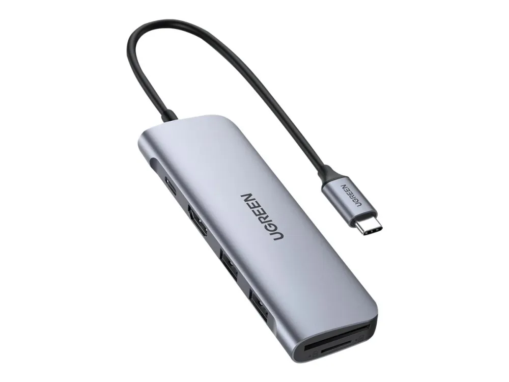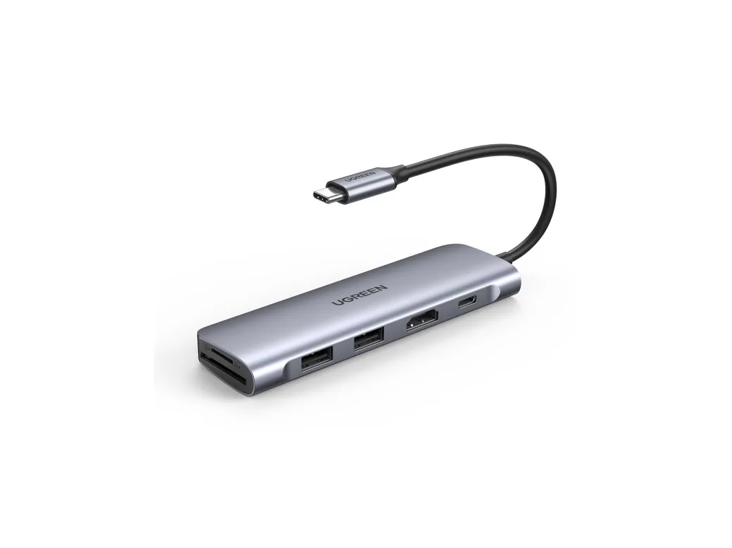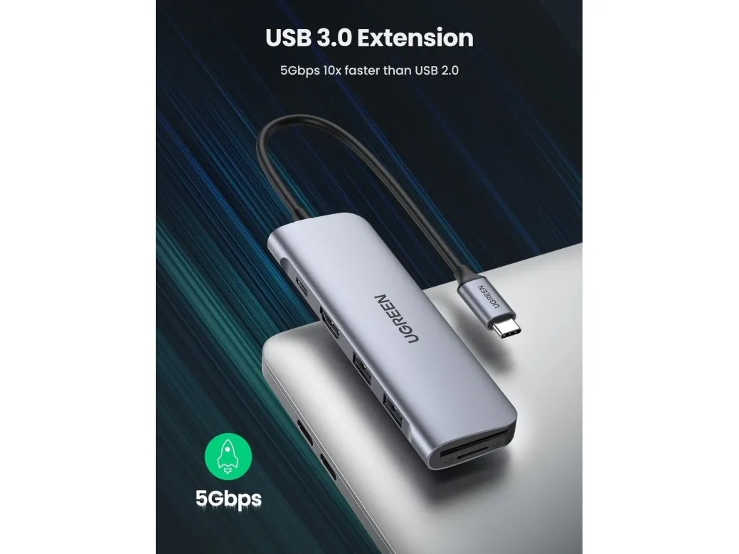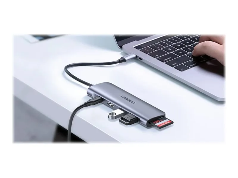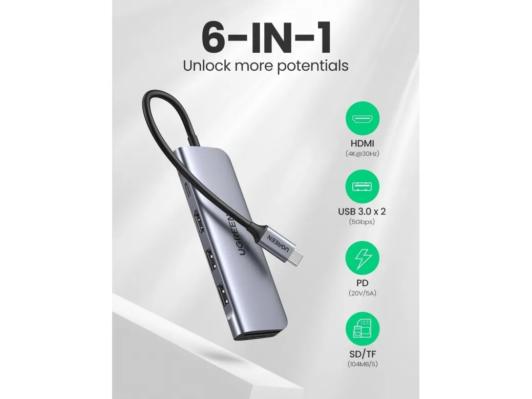 Expand more ports to connect more. UGREEN 6-in-1 USB-C data hub features a 4K HDMI output port, SD and TF card readers, and 3 USB 3.0 ports. And all hub ports can work simultaneously - small yet mighty.