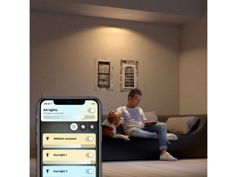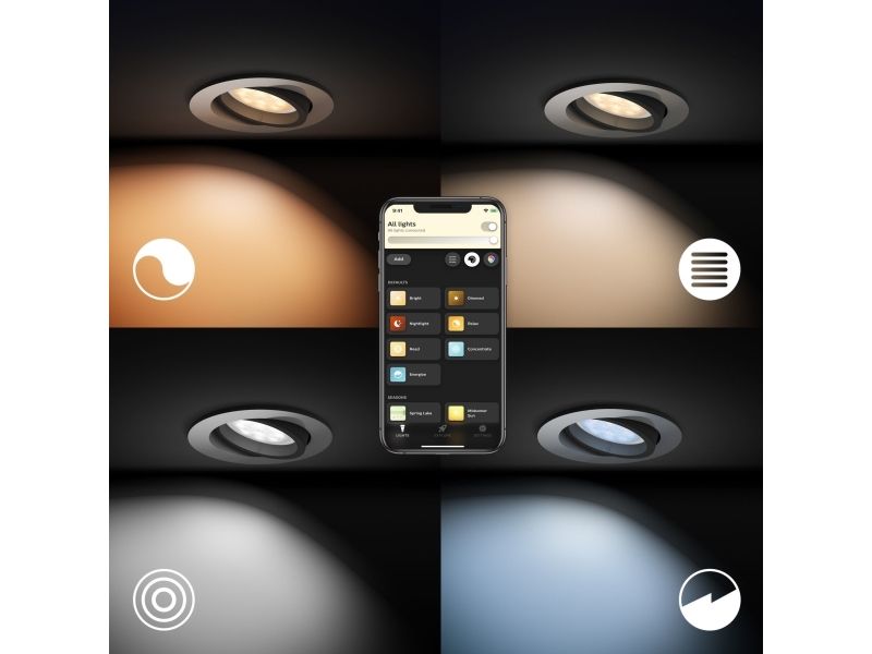 Flush-mount Philips Hue White ambiance Milliskin-spotlyset i aluminium passer sømløst inn i omgivelsene sine mens det gir et varmt til kjølig hvitt lys og har innebygde lysinnstillinger som hjelper deg med å få energi, konsentrere deg, lese og slappe av. Lås opp flere smartbelysningsfunksjoner med en Hue Bridge.