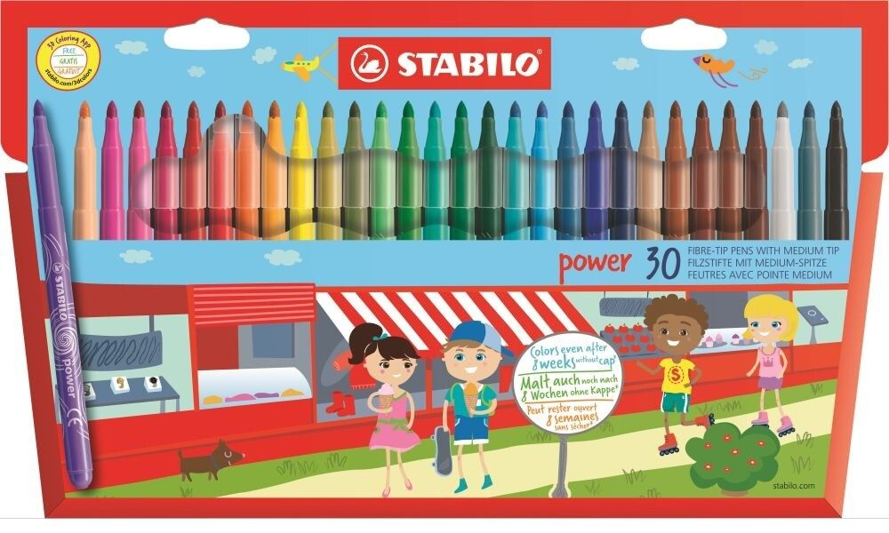 Stabilo Power Børnetusch 30 farver - 2mm streg - kan tåle at ligge uden hætte i op til 8 uger uden at tørre ud