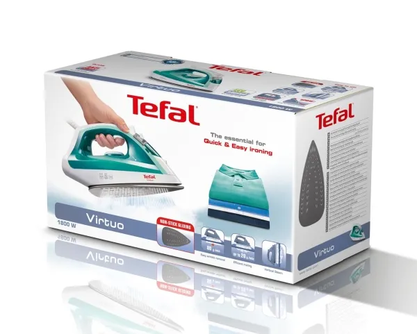 For quick ironing action with results you can count on, Virtuo puts outstanding ease-of-use within reach. This easy-to-use steam iron is equipped with 1800 W of power for quick results, with a continuous steam output of 24g/minute for efficient ironing sessions and an 80 g steam boost to tackle even the most stubborn creases. Performance is matched by convenience and ease-of-use, with a compact design, a non-stick soleplate and an ergonomic steam trigger designed to make ironing easier and more comfortable. Tefal Virtuo FV1710. Type: Steam iron, Soleplate type: Non-stick soleplate, Cord length: 1.9 m. Iron power: 1800 W