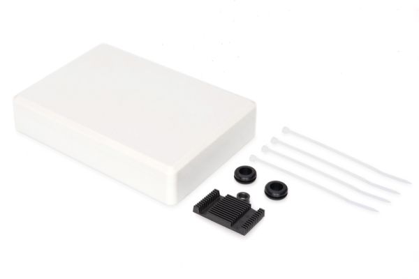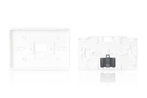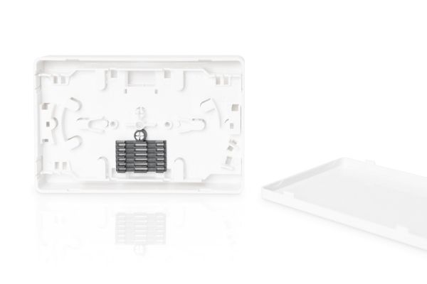 The micro splice box from DIGITUS is primarily designed for FTTH (fiber to the home) applications and can hold up to 12 splice connections. The fibers are fastened by the splice holder in the splice cassette included with delivery, so they are protected in the housing. The housing consists of a base plate, splice cassette and cover and is designed for wall mounting. Cable entry grommets, two cable brackets with adhesive surfaces and cable ties to fix the cables in place are also included in delivery.