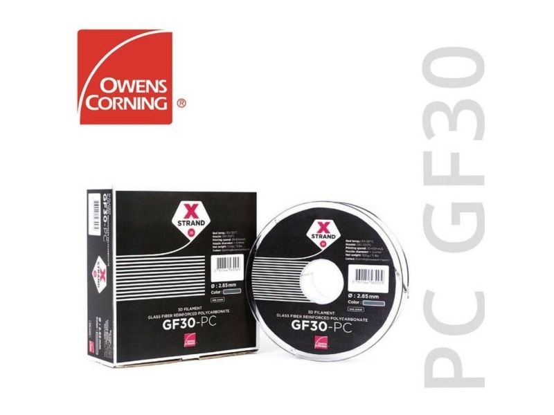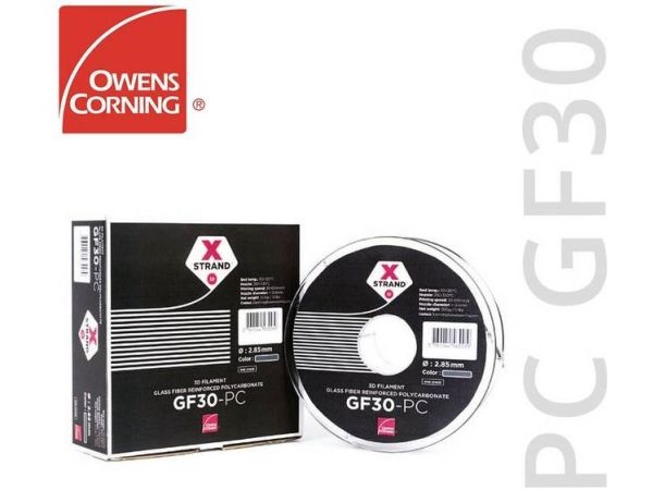 Owens Corning XSTRAND GF30-PC er et polykarbonatfilament til FDM 3D-print, der er udstyret med en 30% fiberandel. Producenten Owens Corning er førende på markedet for kompositmaterialer og blandt andet kendt for sikkerhedsglas og isolering. XSTRAND-filamenterne bringer koncernens ekspertise ind i 3D-printverdenen.