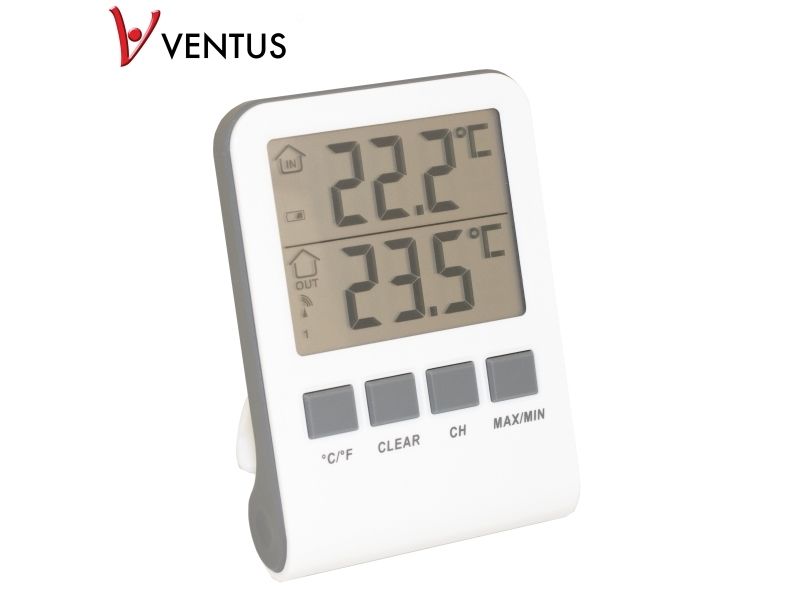 Viser inde/udendørs temperatur, min/max. Trådløs udendørs sensor medfølger.