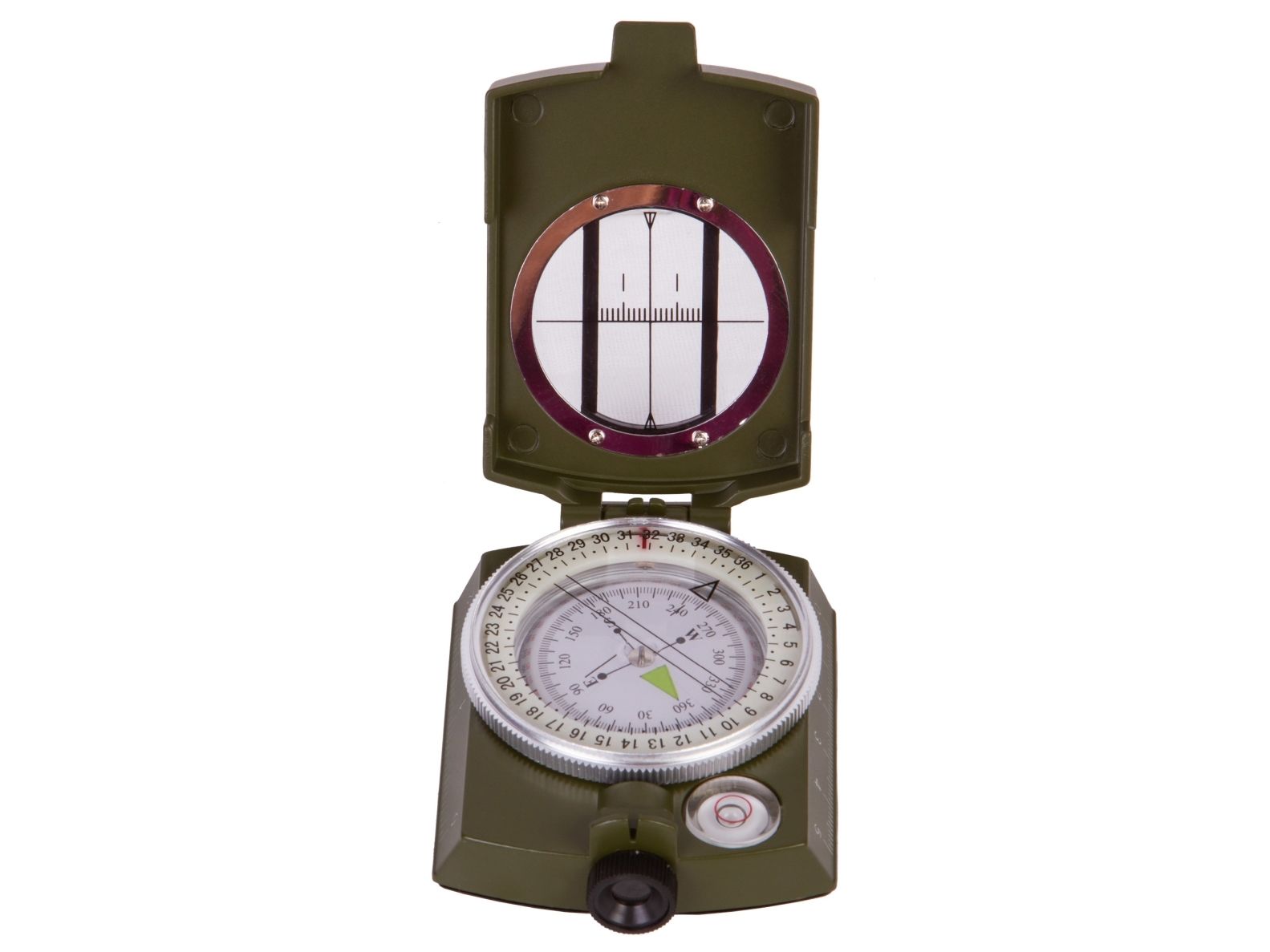 The compass features a folding design; there is a large transparent sighting window in its cover. Due to that, you can read the compass even with the cover closed. A dial plate is placed in a special liquid for a magnetic needle to slow down quickly and show direction. The compass allows for taking a bearing in degrees. There is a built-in bubble level to simplify aligning the compass along the horizontal axis.