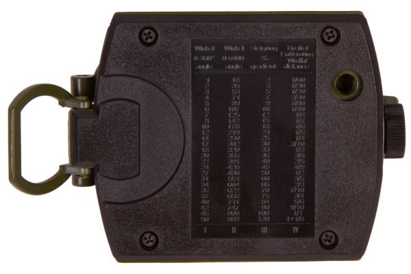 A sighting slot allows for aiming at distant objects and taking a bearing. You can see a precise number through a special lens in the body. In a sighting slot, there is a mil scale for measuring the distance between objects. Two scales are used for working with maps: one scale is in centimeters, the other one is in inches. There is a table with formulas on the back of the compass.