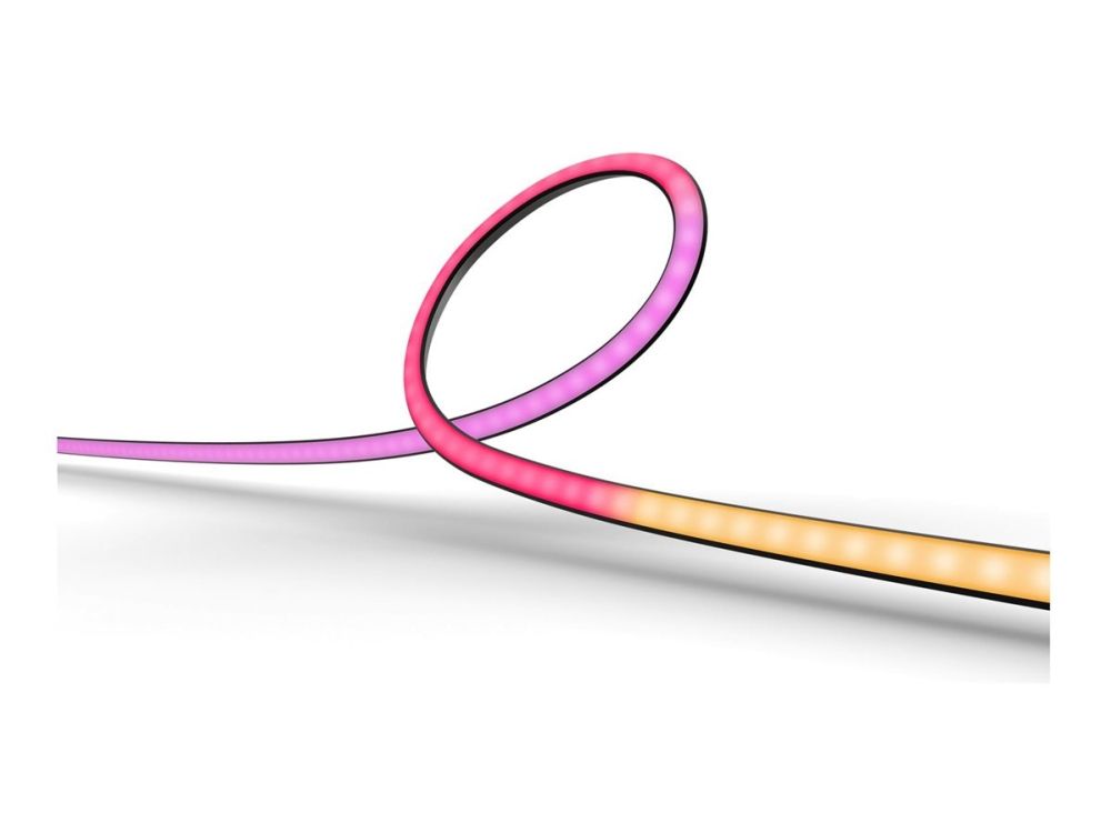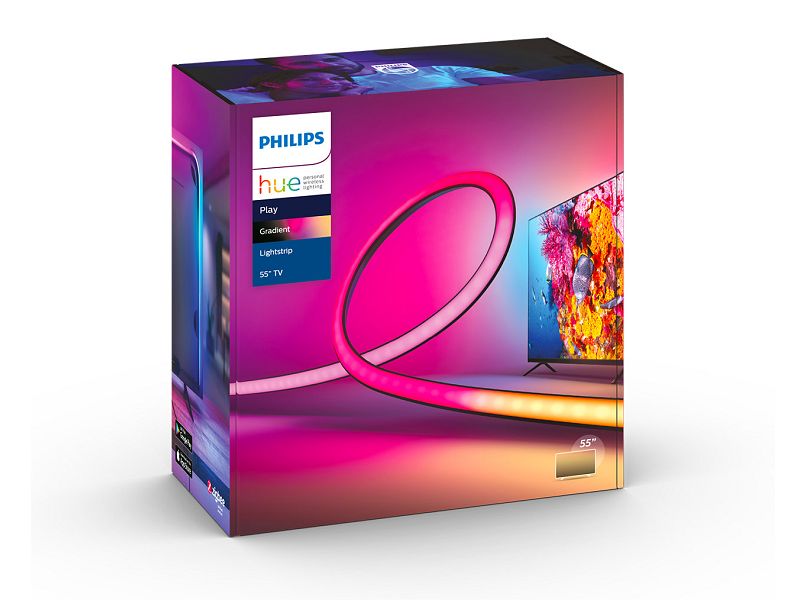 Philips Hue Play Gradient Lightstrip tilbyder en helt ny funktionalitet til dine tilsluttede Hue lyskilder, som er muligheden for individuelt at kontrollere hver LED-diode, hvilket skaber muligheden for at indstille en enkelt Lightstrip til flere forskellige farver på samme tid. Dette giver en enkelt Lightstrip mulighed for, at fylde hele rummet med lys, der fejlfri efterligner den underholdning, du ser på skærmen. Lightstripen er meget nem at installere og leveres i 3 forskellige længder, specielt lavet til tv'er i tre forskellige størrelser: 55 ”, 65” , og 75 ”. Hvis du vælger den rigtige længde til dit tv, kan du dække venstre og højre side såvel som toppen af ??skærmen med den samme lysstrimmel. Selvfølgelig, hvis du vil opnå den samme effekt andre steder i i rummet, kan en lightstrip også fastgøres til andre overflader efter eget valg. En Lightstrip kan ikke udvides eller udskæres for at gøre den kortere.