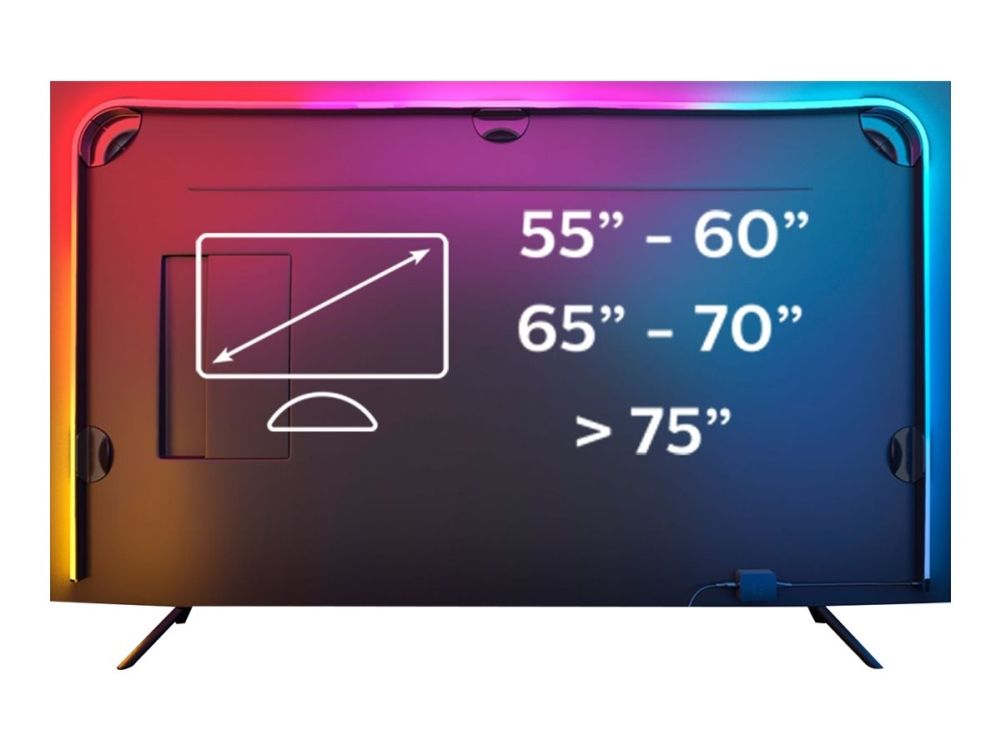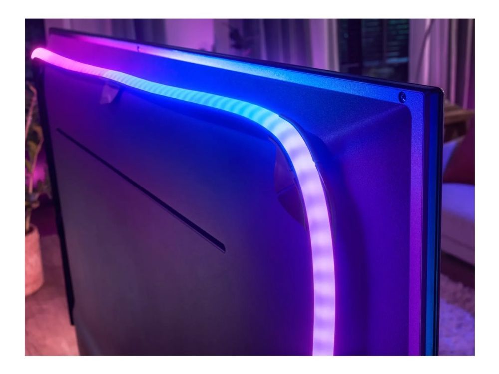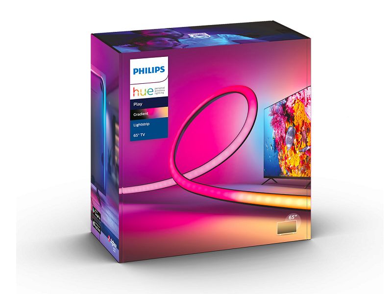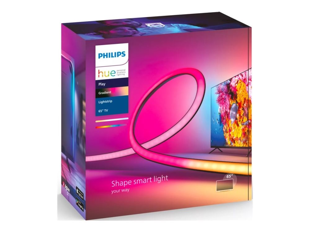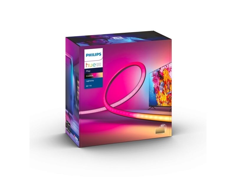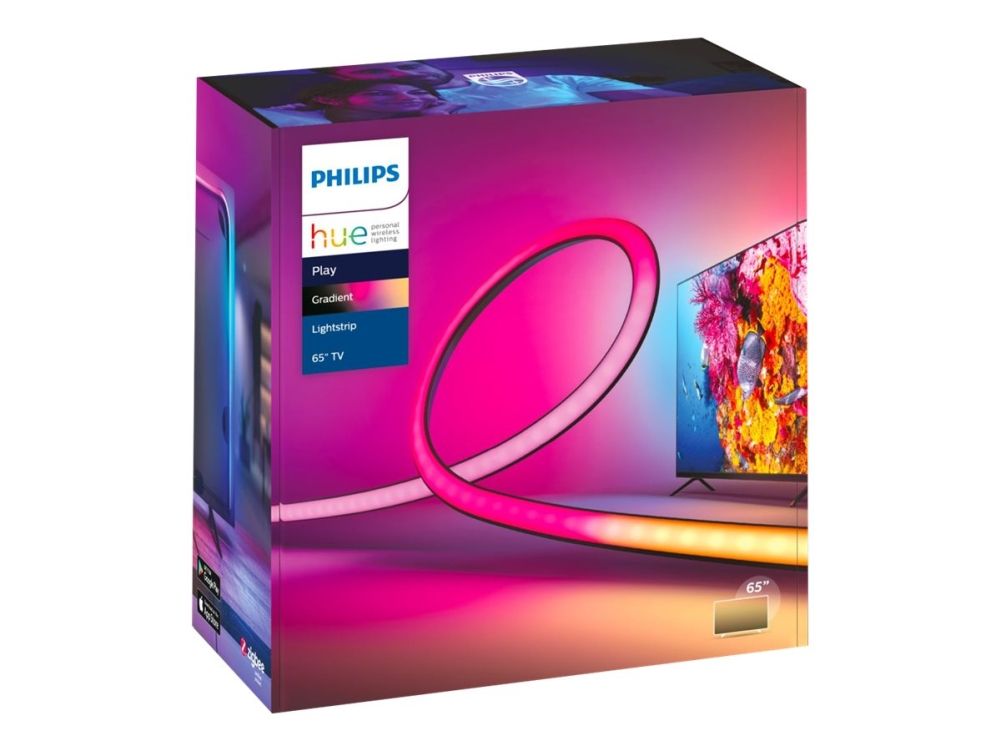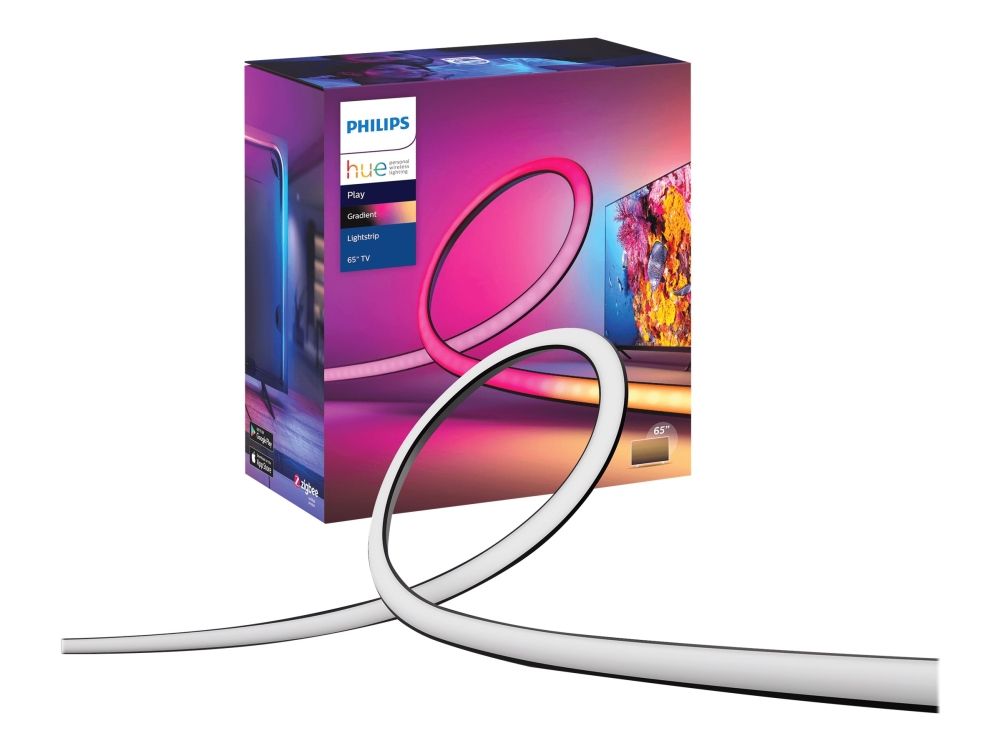 Philips Hue Play Gradient Lightstrip tilbyder en helt ny funktionalitet til dine tilsluttede Hue lyskilder, som er muligheden for individuelt at kontrollere hver LED-diode, hvilket skaber muligheden for at indstille en enkelt Lightstrip til flere forskellige farver på samme tid. Dette giver en enkelt Lightstrip mulighed for, at fylde hele rummet med lys, der fejlfri efterligner den underholdning, du ser på skærmen. Lightstripen er meget nem at installere og leveres i 3 forskellige længder, specielt lavet til tv'er i tre forskellige størrelser: 55 ”, 65” , og 75 ”. Hvis du vælger den rigtige længde til dit tv, kan du dække venstre og højre side såvel som toppen af ??skærmen med den samme lysstrimmel. Selvfølgelig, hvis du vil opnå den samme effekt andre steder i i rummet, kan en lightstrip også fastgøres til andre overflader efter eget valg. En Lightstrip kan ikke udvides eller udskæres for at gøre den kortere.