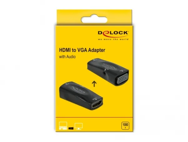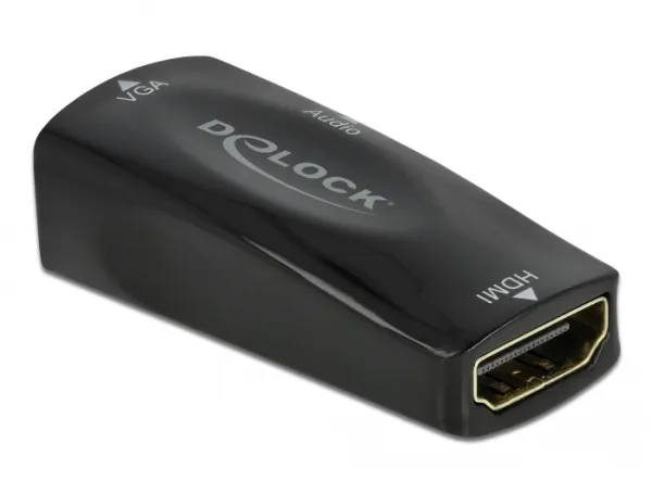 This adapter by Delock can be used to connect e.g. a VGA monitor to a free HDMI interface of the system. Furthermore, it is possible to transfer the audio signal via the stereo jack female port.