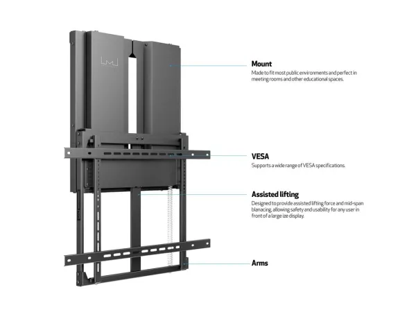The M Counterbalanced Wallmount a Dynamic Height adjustable TV Wallmount for Interactive display panel allows users to raise and lower large displays with only a light effort to varied vertical positions. With a vertical movement range of 400 mm the M Counterbalanced Wallmount is the perfect wallmount for schools using interactive displays where small children need to reach the interactive panel. The flexible movement a lets you set the height depending on situation and audience. Faster and easier than traditional electric mounts with no power required.