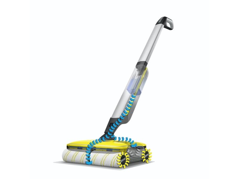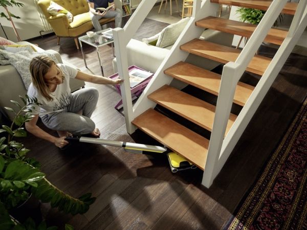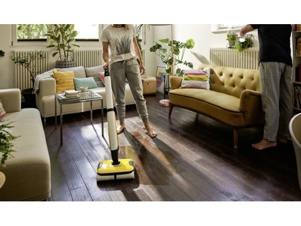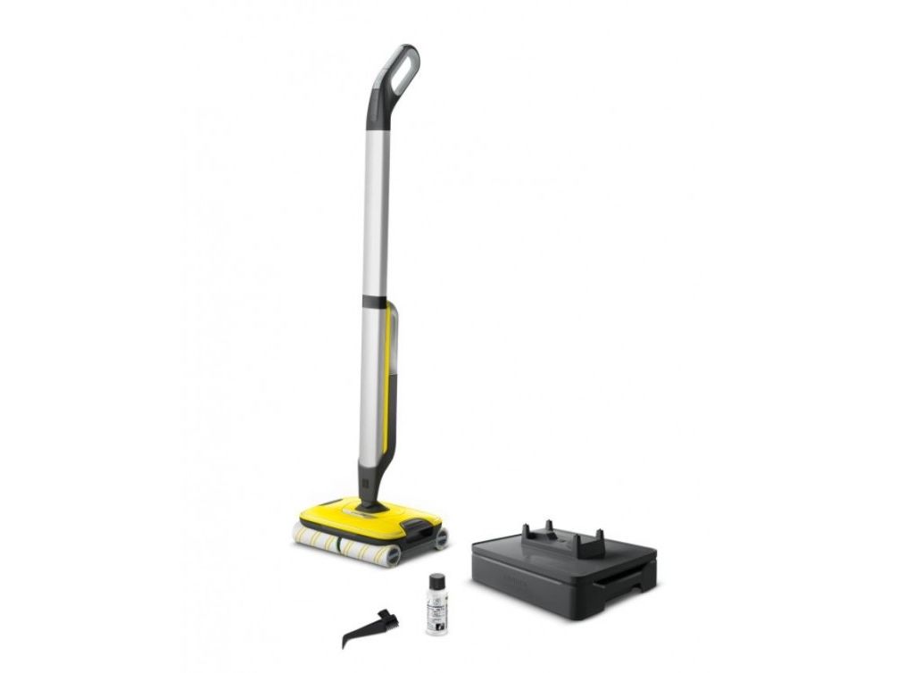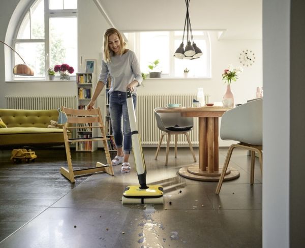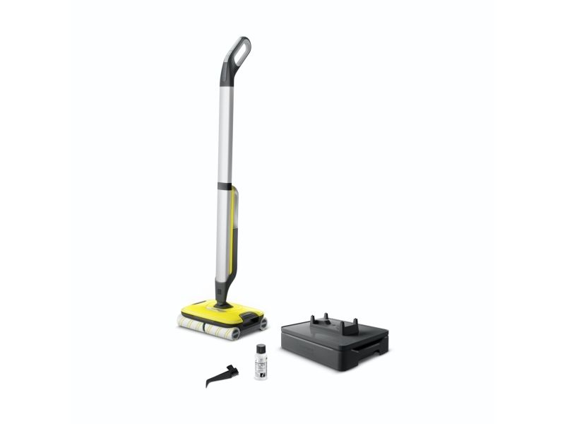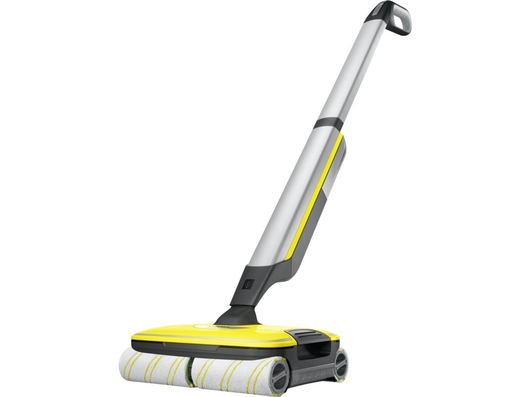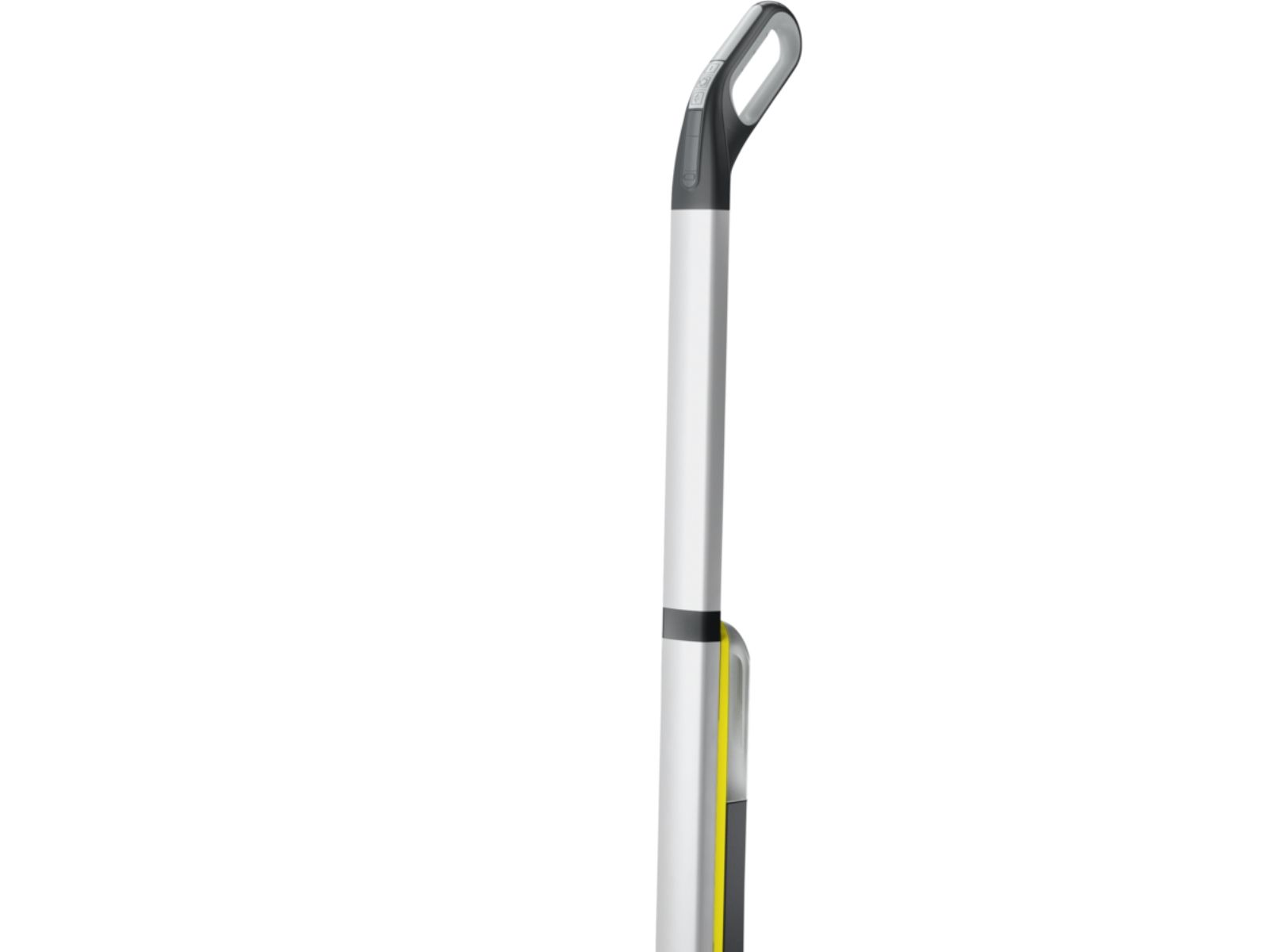 Den batteridrevne gulvvaskeren FC 7 samler opp tørr og våt smuss i ett steg. Nå trenger du ikke lengre å støvsuge før du mopper, hvilket sparer deg for halvparten av tiden. Fire valser som roterer mot hverandre muliggjør rask og effektiv gulvvask. Selv hår tas opp uten problem takket være hårfilteret. Gulvet blir opp til 20% renere enn med vanlig mopp - helt til kantene. Bryet med å dra en bøtte rundt er borte og du slipper å ha kontakt med det møkkete vannet, da maskinen har både en tank for rent- og en for skittent vann. Vannvolum og rotasjonshastighet kan stilles inn i to ulike vaskemoduser for å matche gulvtypen. Maskinen har også en boost-funksjon for flekker som sitter. Batteriet har en driftstid på 45 minutter, nok til å vaske et område på ca 135 kvm. Gulvvaskeren passer til alle type harde gulv (fliser, parkett, laminat, PVC, vinyl, stein) og glir smidig over gulvet.