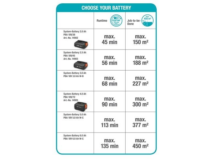 Supplied without batteries and charger, it is compatible with all 18V POWER FOR ALL batteries and chargers. Depending on the battery selected, the product can reach a maximum battery run time of up to 135 minutes or cut up to 450 square metres of hedge.