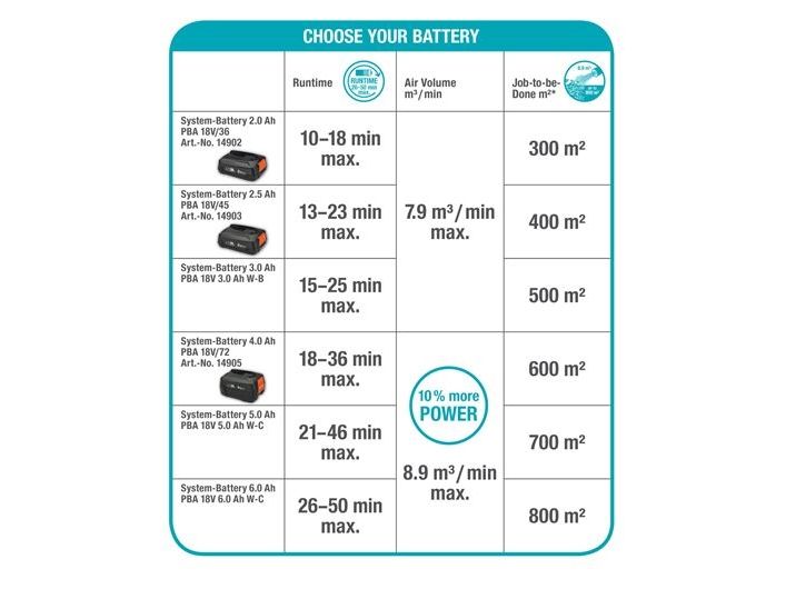 Supplied without battery and charger, this blower is compatible with all 18V POWER FOR ALL batteries and chargers. Depending on the battery selected and the set power, the product can reach a maximum battery run time of 26 – 50 minutes.