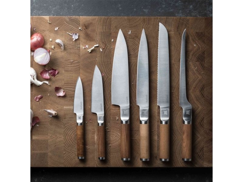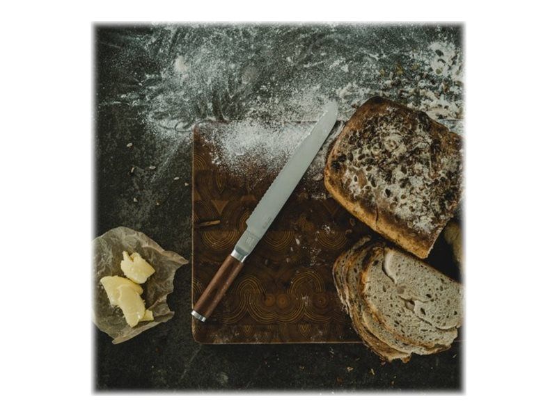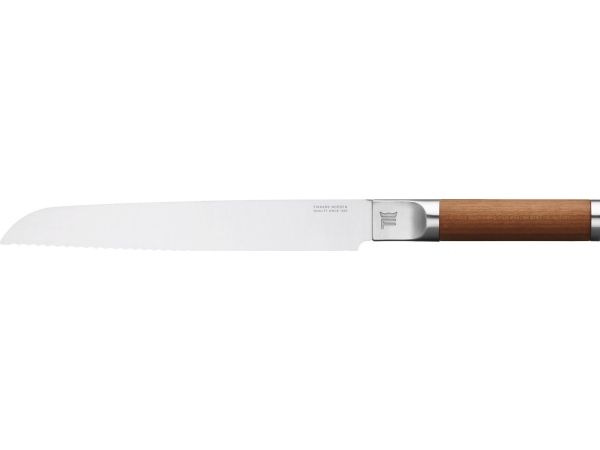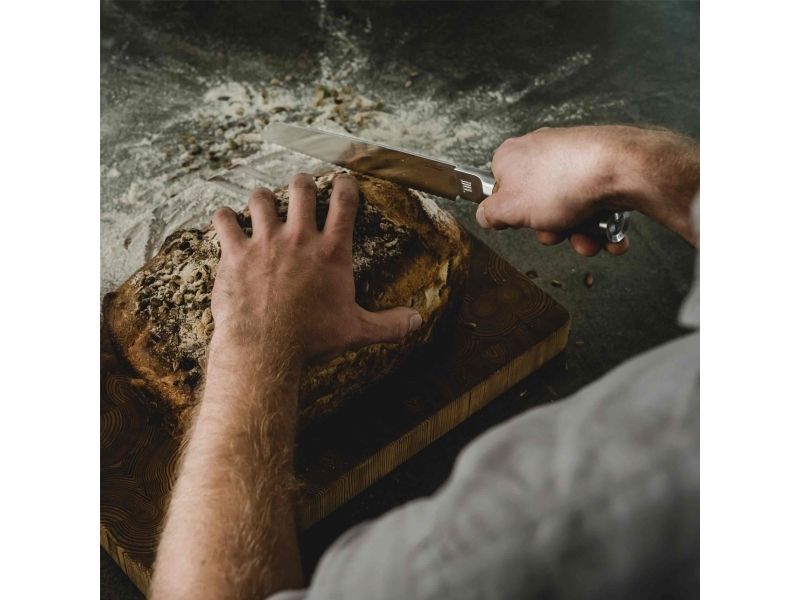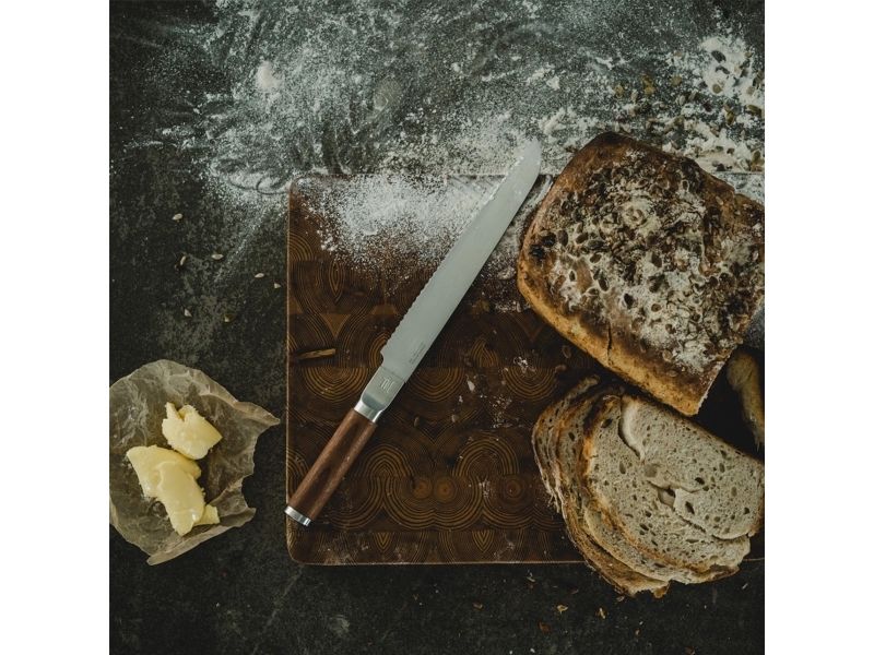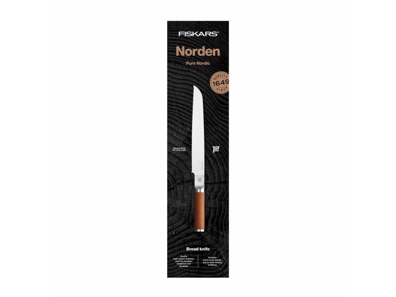 Fiskars Norden knives are made from premium materials. The Bread knife's serrated cutting edge is ideal for cutting bread with a hard crust. The premium quality blade is made of high-performing, high carbon German steel, which ensures superior performance and long-lasting sharpness. Excellent sharpness is further enforced by the optimal 26° sharpening angle. The knife handle is crafted from Finnish heat treated birchwood, making the knife both very comfortable and naturally beautiful. Blade hardness HRC 56. Hand washing recommended. Made in Finland.