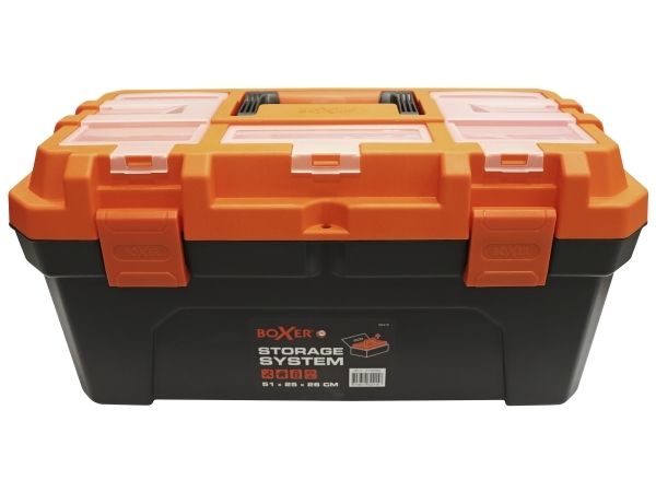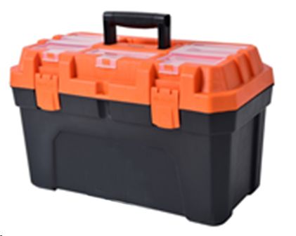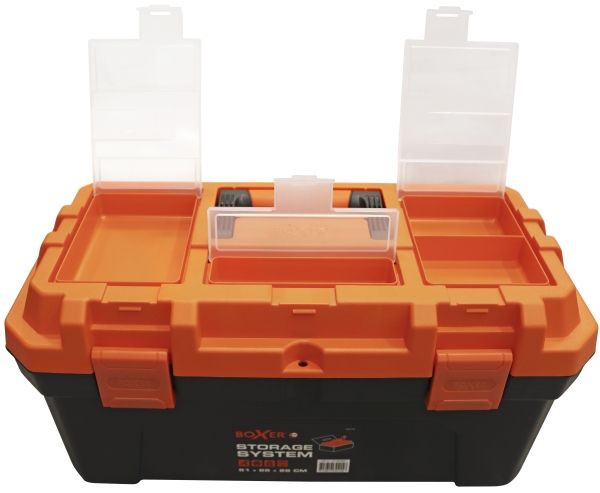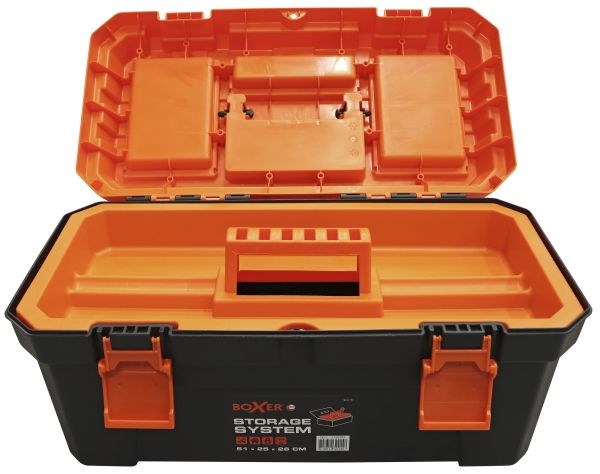Størrelse: 20" Længde: 50,7 cm Bredde: 25,4 cm Højde: 25,9 cm Indbygget sortimentskasse i låget. Indsats med håndtag Materiale: PP kraftig plast Farve: sort / orange / transparent