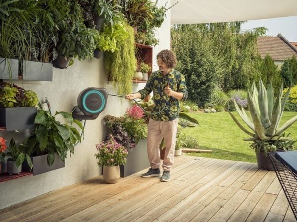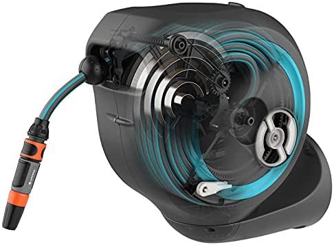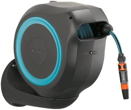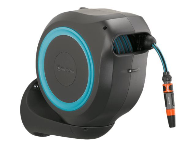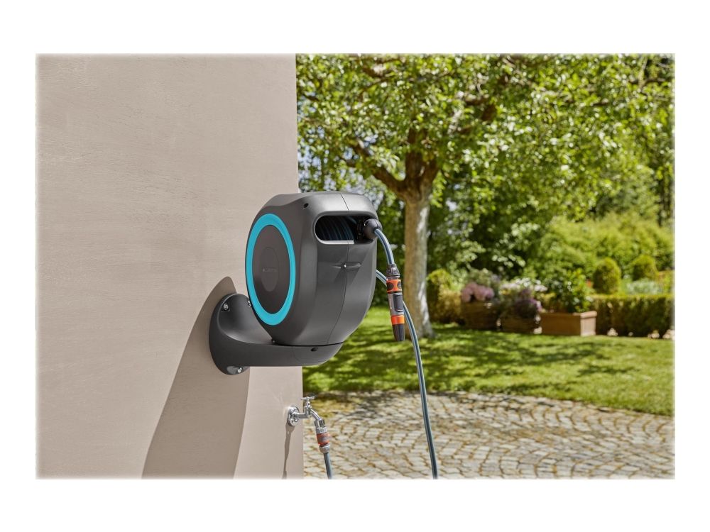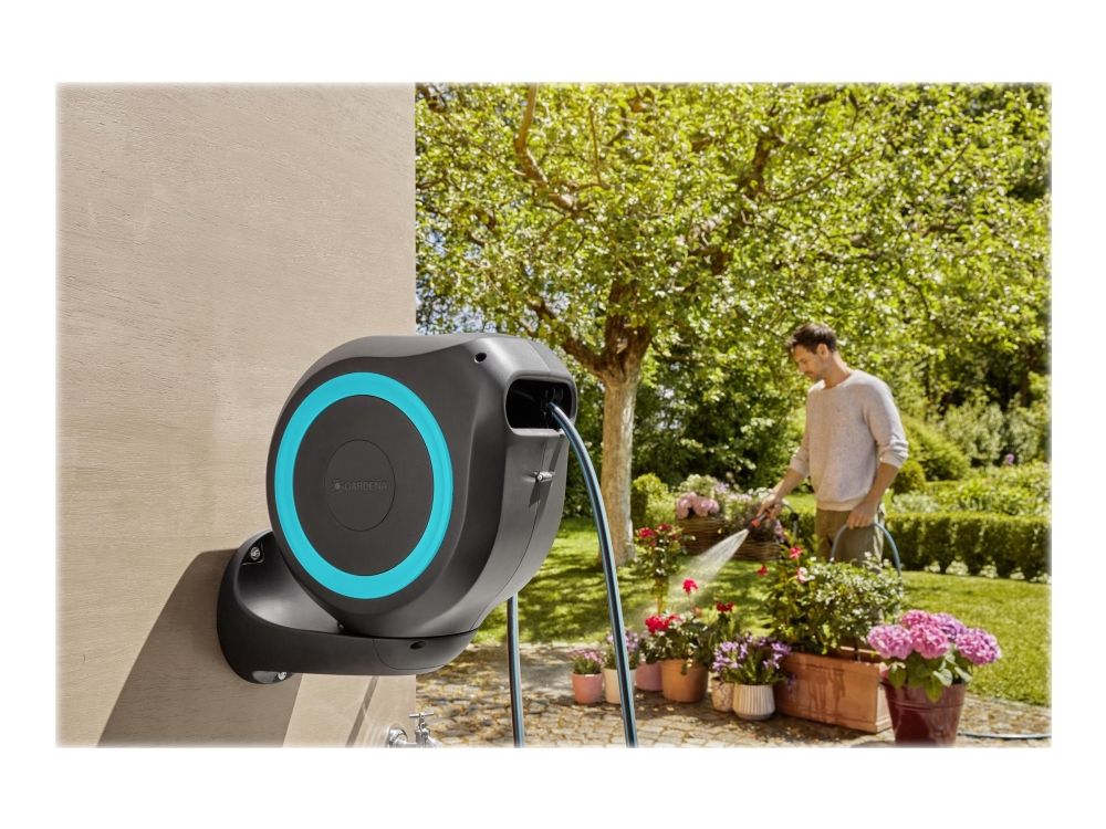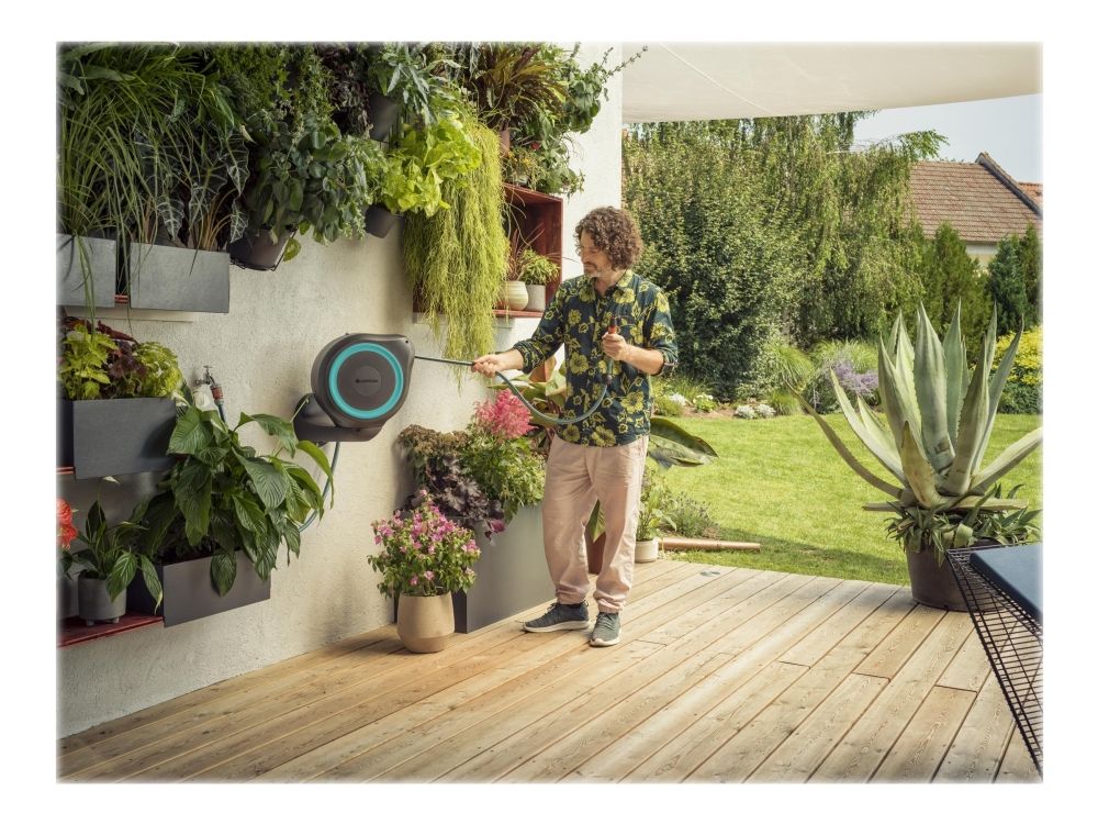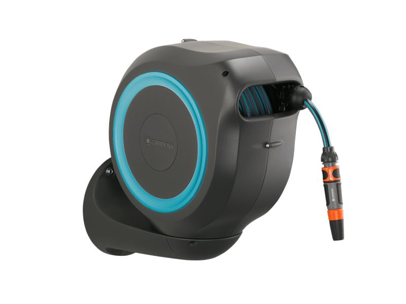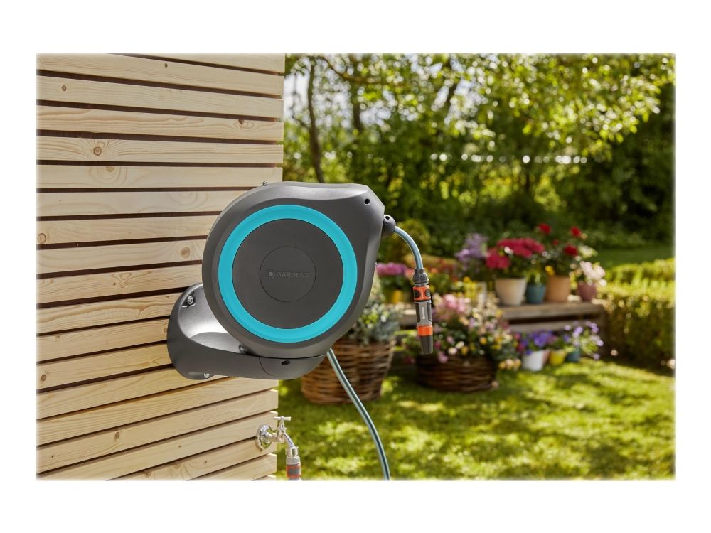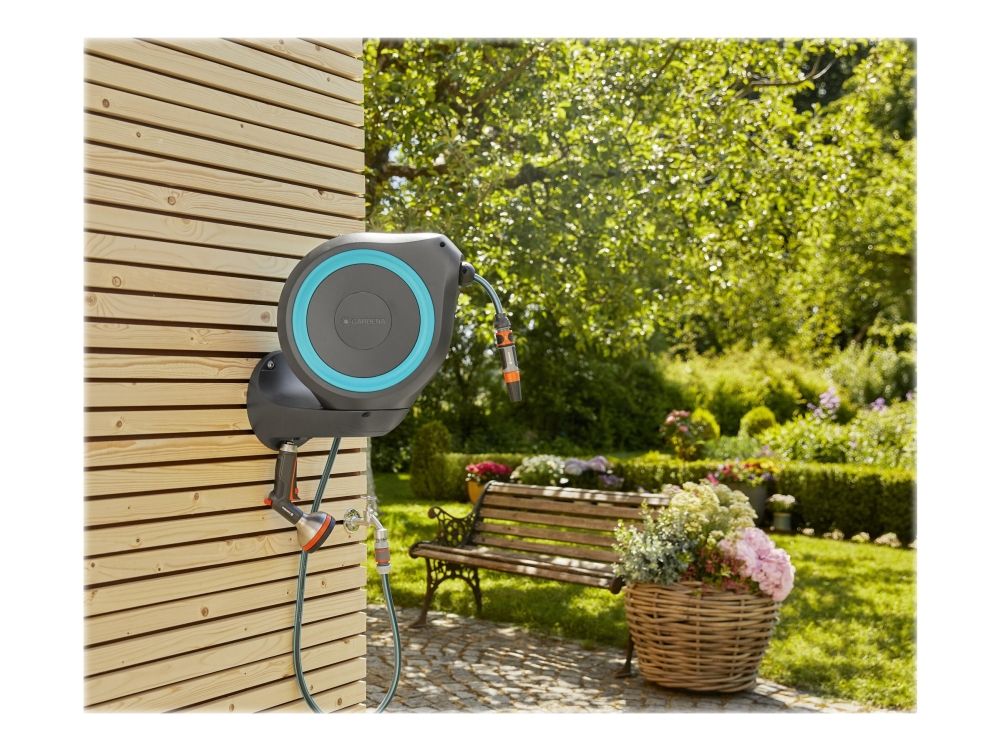 Convenient and flexible irrigation of medium-sized gardens with the compact Wall-Mounted Hose Box RollUp M Watering that’s always ready for action—with the GARDENA Wall-Mounted Hose Box RollUp M. When watering your garden with this hose box you save both effort and time, as well as a lot of storage space. This compact box is simply attached to the wall of the house and, in addition to safe storage of the water hose, makes it easier for you to roll it up after watering. Thanks to the wall bracket which can be swivelled by more than 180°, you have a lot of freedom of movement during watering and the hose does not kink. Simply pull out the 20-metre hose to the desired length and you can start watering immediately! The practical locking points automatically fix the garden hose at particularly short intervals, so that you can water your plants very easily. With a light pull on the end of the hose, you release the locking mechanism and a built-in steel spring automatically and reliably rolls the hose back in for you. To ensure that the environment and the casing of the hose reel remain undamaged, the retraction mechanism has an innovative RollControl technology, providing safe and controlled retraction. Tangling or knotting during the rolling in process is prevented by an integrated hose guide. With the Tap and Hose Connectors from the Original GARDENA System you can flexibly extend the hose or attach other GARDENA Watering Attachments. Your GARDENA Hose Attachments are always ready to hand, they can be attached underneath the wall bracket and be stored there to save space. Of course the Wall-Mounted Hose Box is made of high-quality materials, which offer both UV and frost protection, the robust box can be used all year round. Furthermore, thanks to the theft protection, the box cannot be stolen and can only be taken off the wall by you. In addition to the Wall-Mounted Hose Box, the box contains the wall bracket, a flexible connecting hose, all necessary Original GARDENA System and Assembly Parts as well as a sprayer with two different spray jet options. GARDENA gives a five-year warranty on this quality product.
