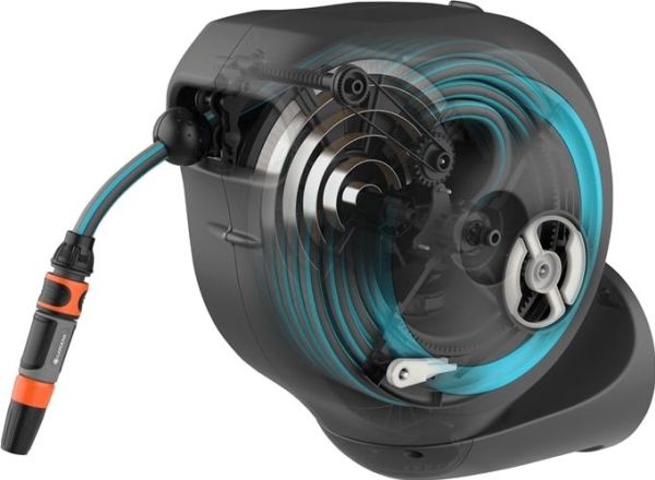 RollControl With a light pull at the end of the hose, the integrated steel spring is activated and rewinds the hose automatically and reliably. The RollControl technology ensures slow and safe retraction, no matter how far the hose is unrolled.