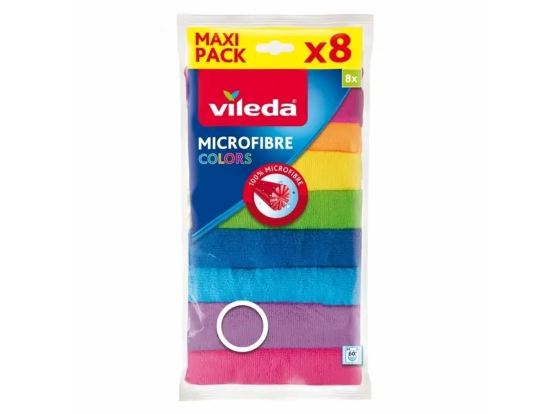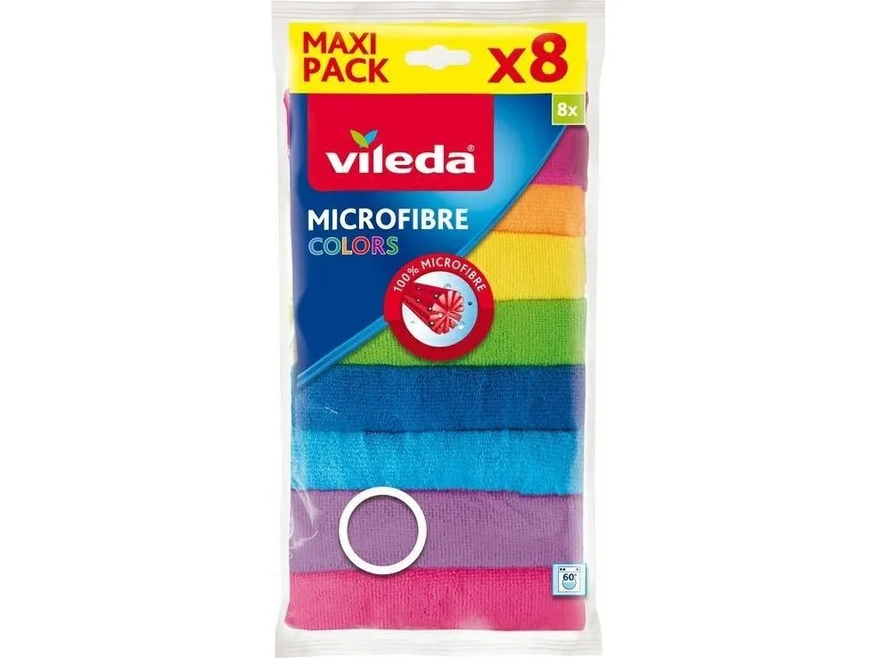 Vileda 148394. Material: Microfibre, Polyamide, Polyester, Product colour: Multicolour, Washing type: Machine wash. Width: 300 mm, Height: 300 mm. Quantity per pack: 8 pc(s). Package width: 185 mm, Package depth: 38 mm, Package height: 310 mm