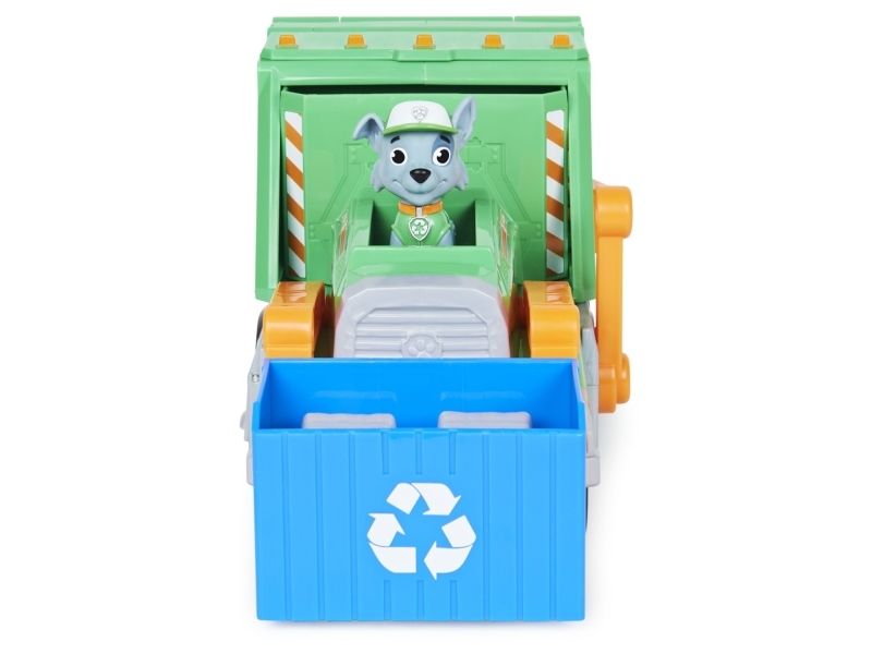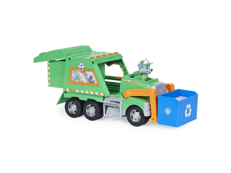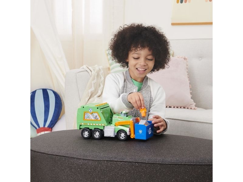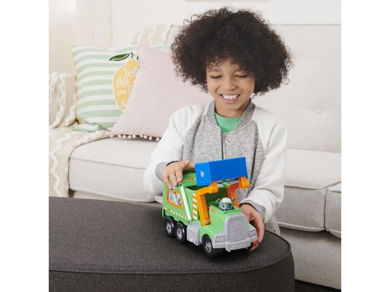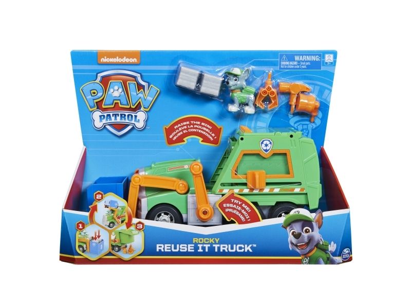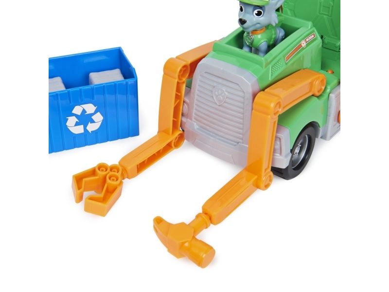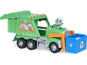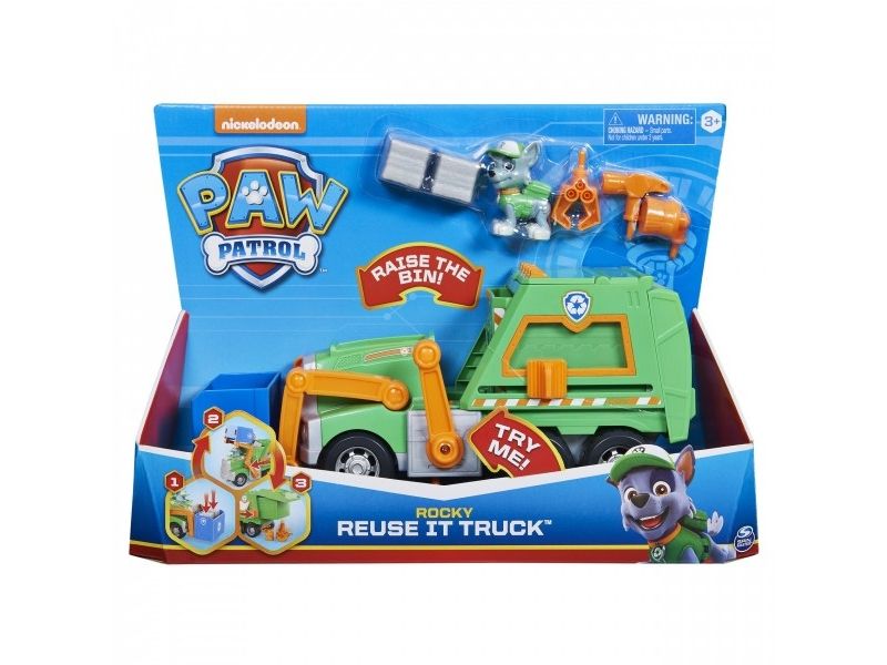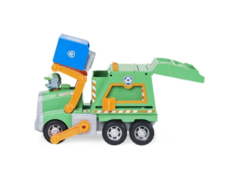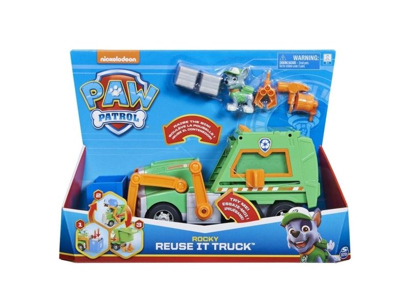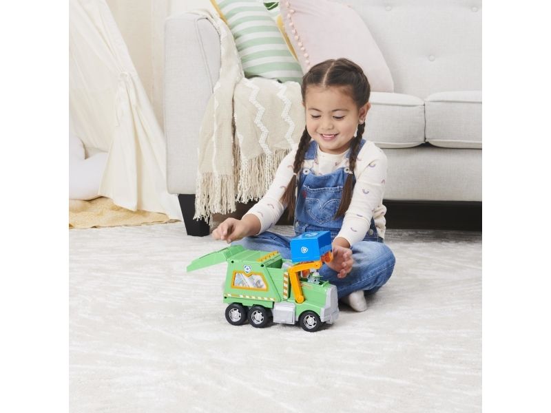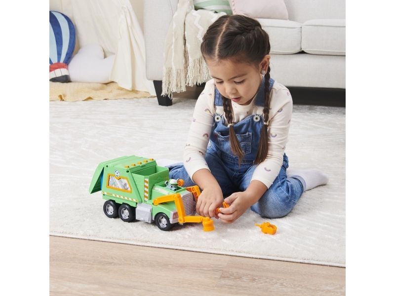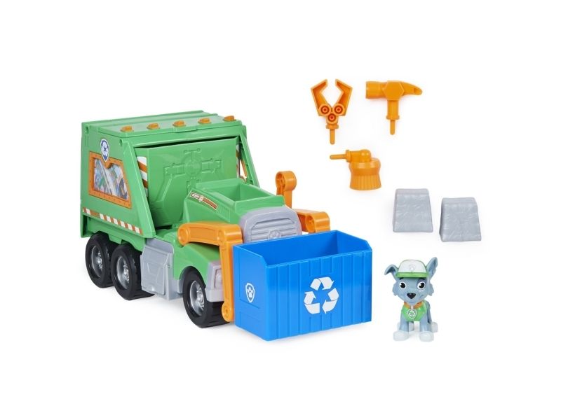 Don’t lose it, reuse it! With PAW Patrol’s Rocky and his Reuse It Truck, you can recycle materials and turn them into tools to help you save the day! Equipped with rolling wheels and moving arms, Rocky’s Reuse It Truck makes it easy to play out your missions. Place Rocky behind the wheel and use your imagination to roll through the streets of Adventure Bay, looking for items to recycle. Slide the dumpster onto the truck’s arms and load it up with the metal cubes (two included) and get ready to turn them into something new! Push the lever on the truck down to make the arms lift and watch as the dumpster empties the cubes into Rocky’s truck, just like a real recycling truck! Next, slide the knob on the side of the Reuse It Truck and get a sneak peek at the compactor through the side window! Once the truck is finished recycling, your metal cubes transform into three handy tools that easily clip onto the truck’s arms. Remove the dumpster and mix and match up to two tools at a time. Use the brush to sweep the streets, pick up trash with the claw and make repairs with the hammer! Plus, you can even rotate the arms for even more ways to play. When you’re finished your mission, lift the top of the truck to store the tools and metal cubes inside. Team up with the rest of the pups and their rescue vehicles (each sold separately) for more PAW Patrol adventures! Bring home recycling fun with Rocky’s Reuse It Truck!