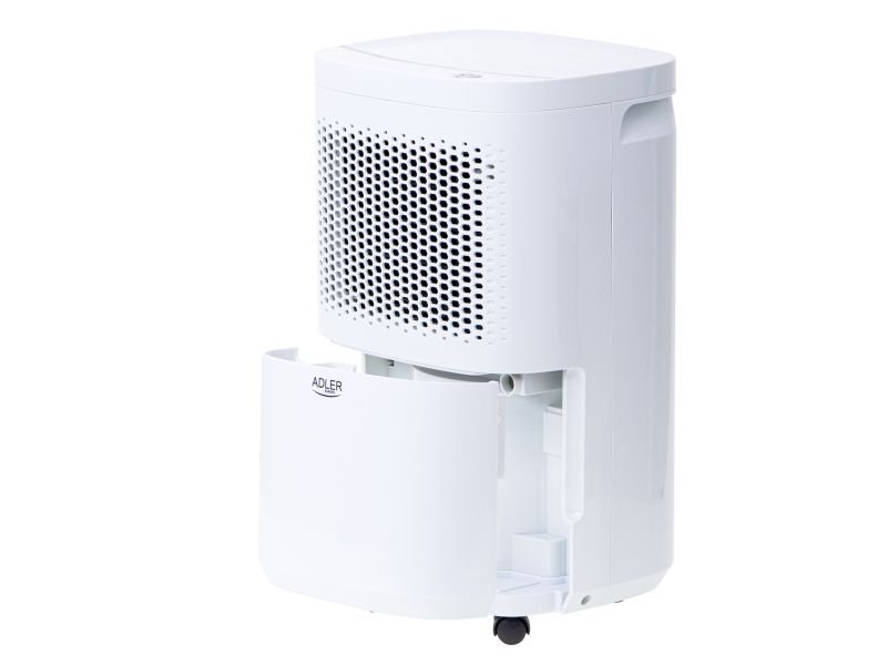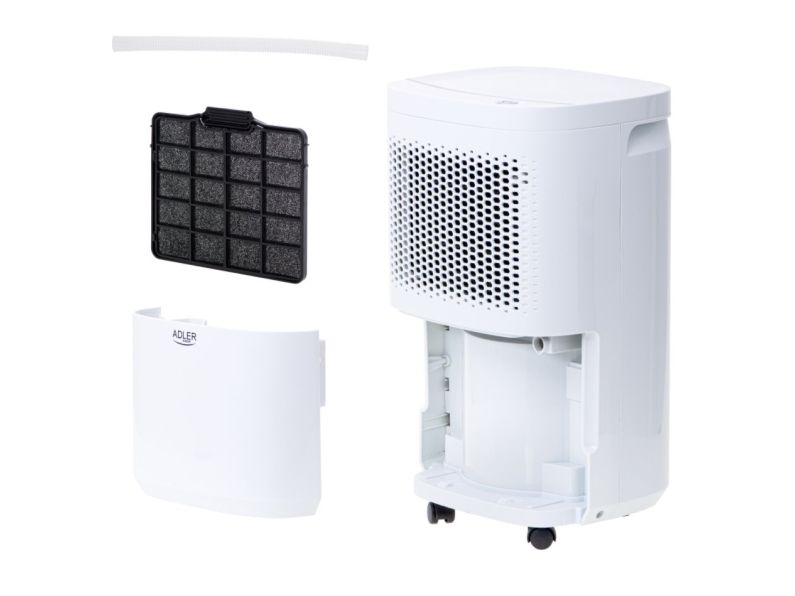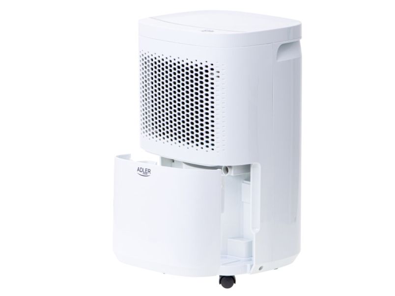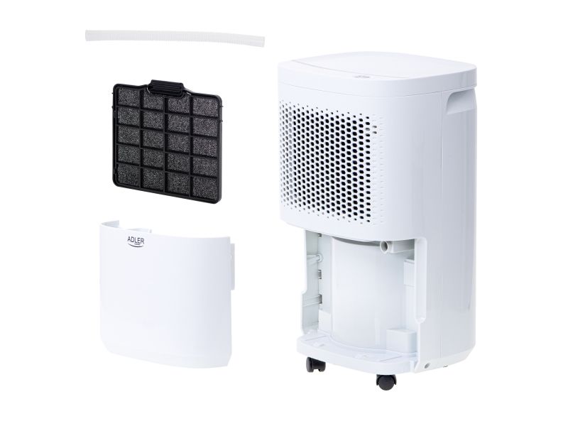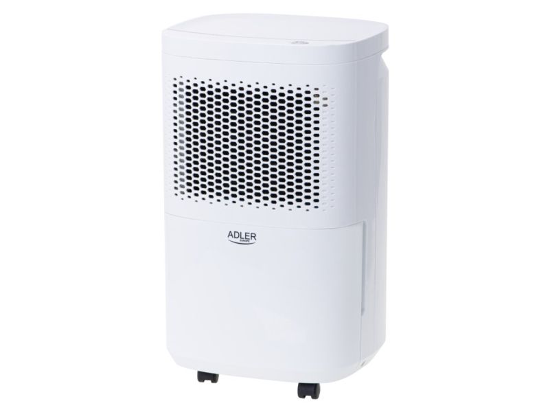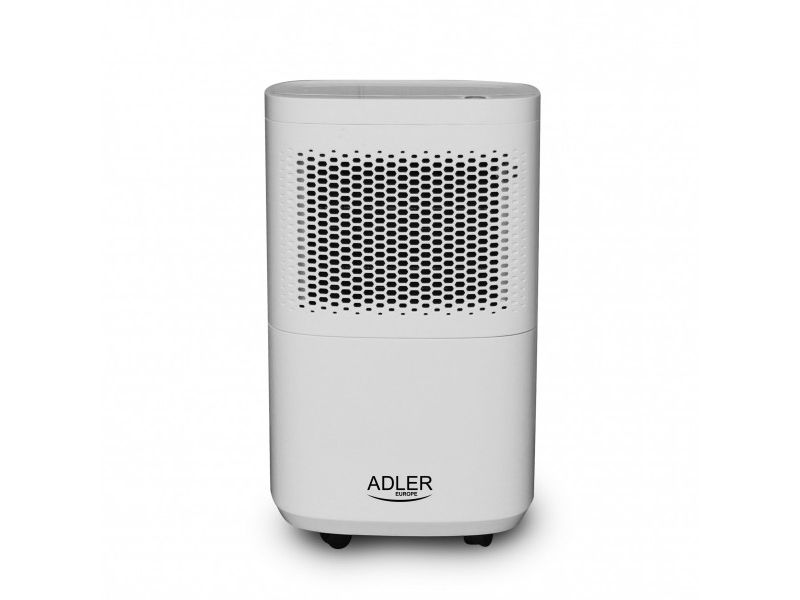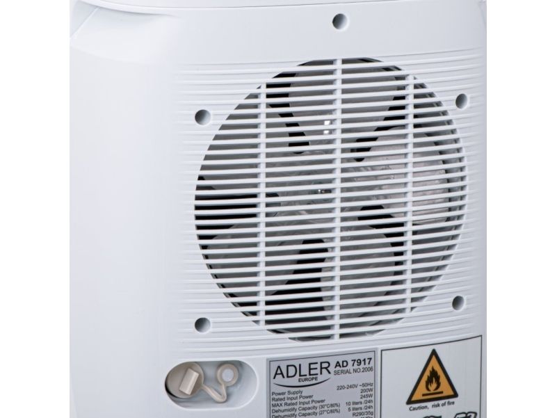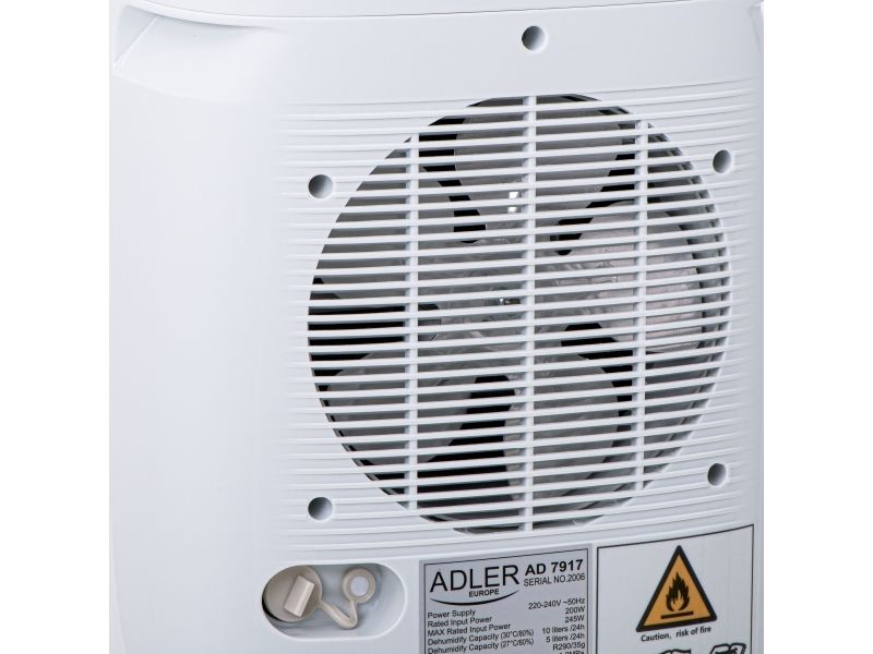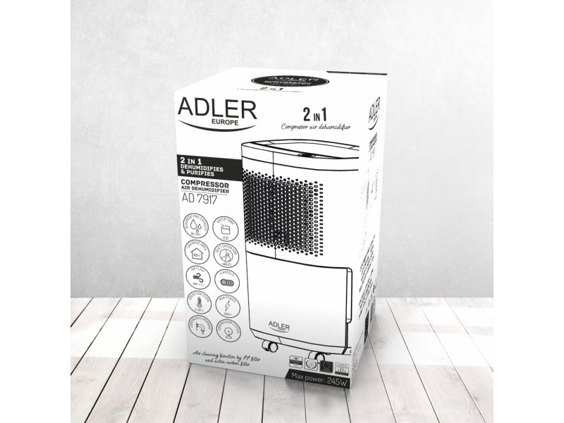Used regularly, it reduces the risk of appearing walls the mold and the fungus that have a negative impact on human health. The device is operated with a single button, which makes it childs play in everyday use. When the built-in tank fills up with water, the device turns off automatically so there is no risk of flooding the room. High efficiency thanks to the compressor allows the absorption of up to 10 liters of water per day from the air. The dehumidifier has an aesthetic appearance, relatively small size and wheels for easy transport. By using two filters (pollen and carbon), the device while dehumidifying the room cleans the air at the same time. The product is intended for rooms with a volume up to 60m3 and a temperature of 5-32 ° C. During production was applied an environment-friendly R290 refrigerant. The device can also work in continuous mode by draining water directly to the sewage system instead of the built-in tank.Adler AD 7917. Power consumption (typical): 200 W, Power consumption (max): 245 W, Power plug type: Type EF (CEE 7/7). Width: 280 mm, Depth: 240 mm, Height: 480 mm. Package width: 315 mm, Package depth: 284 mm, Package height: 528 mm