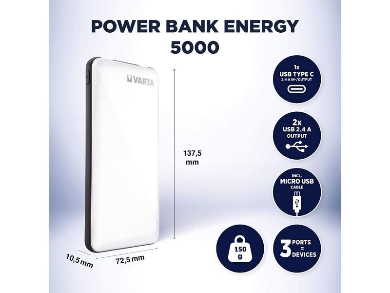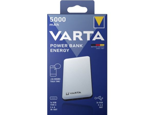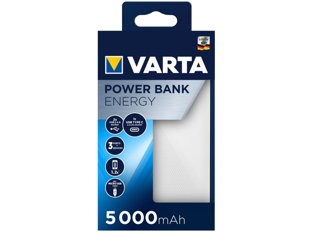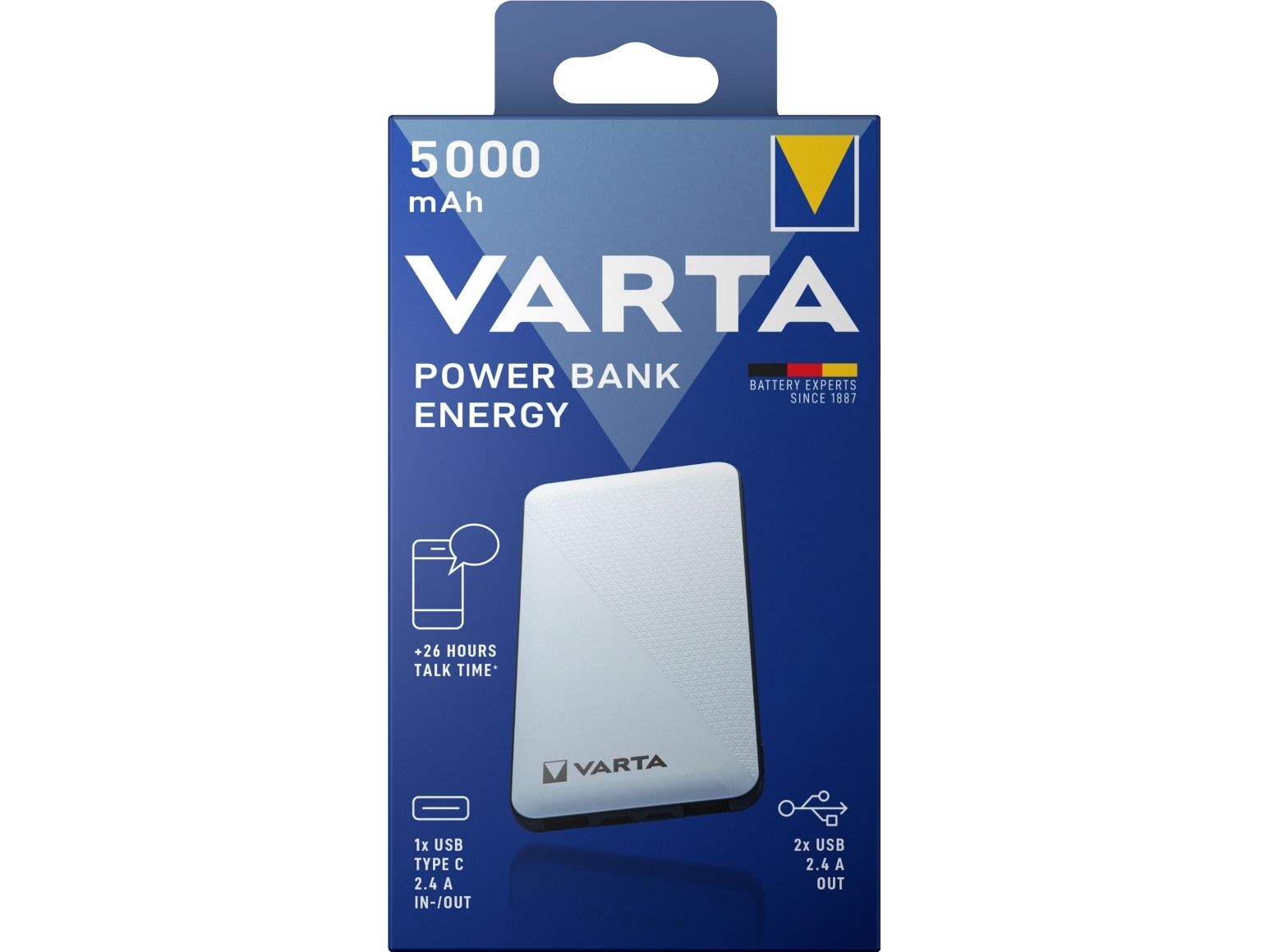 Varta Energy - Strømbank - 5000 mAh - 18.5 Wh - 12 watt - 3 utgangskontakter (2 x USB, USB-C)