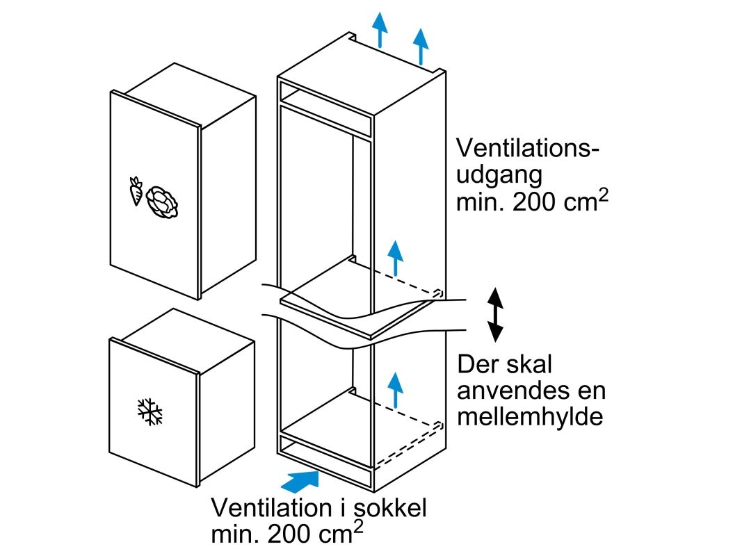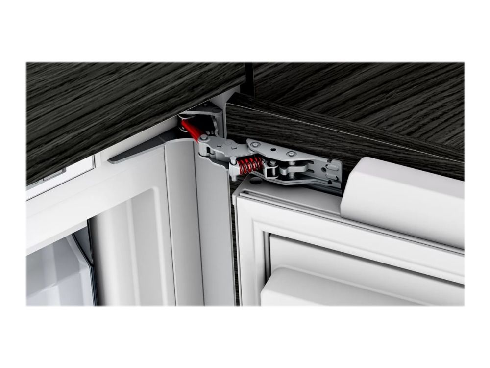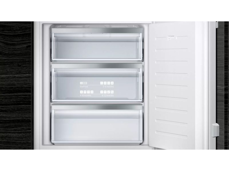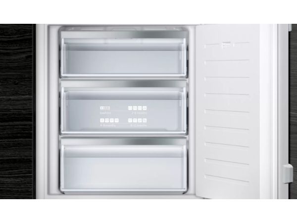 Innebygd fryseskap med 3 praktiske, gjennomsiktige fryseskuffer og rask innfrysing av matvarer med superfreeze. lowFrost-teknologi for mindre isdannelse og raskere avriming. softClosing: døren som aldri står på gløtt. 3 gjennomsiktige fryseskuffer, god plass og optimal oversikt. softClose, døren lukkes automatisk og mykt fra en åpningsvinkel på 20° eller mindre.