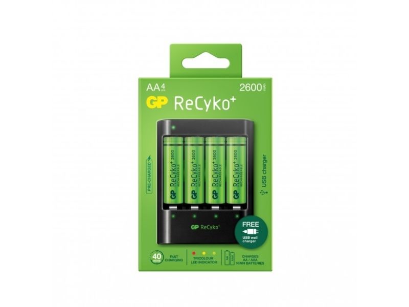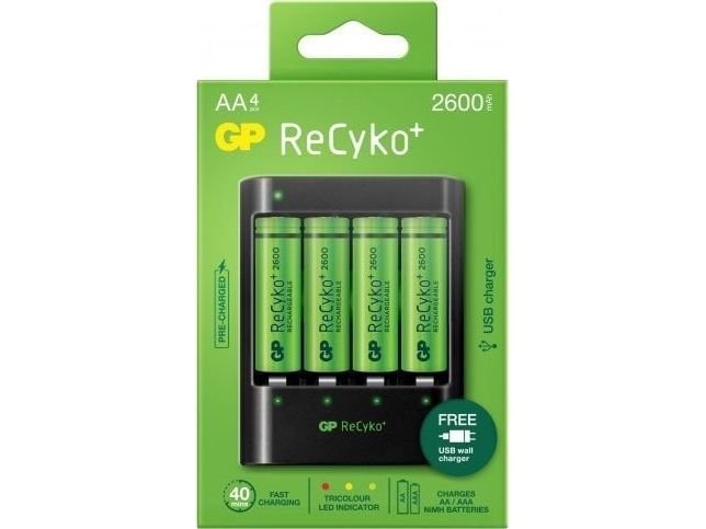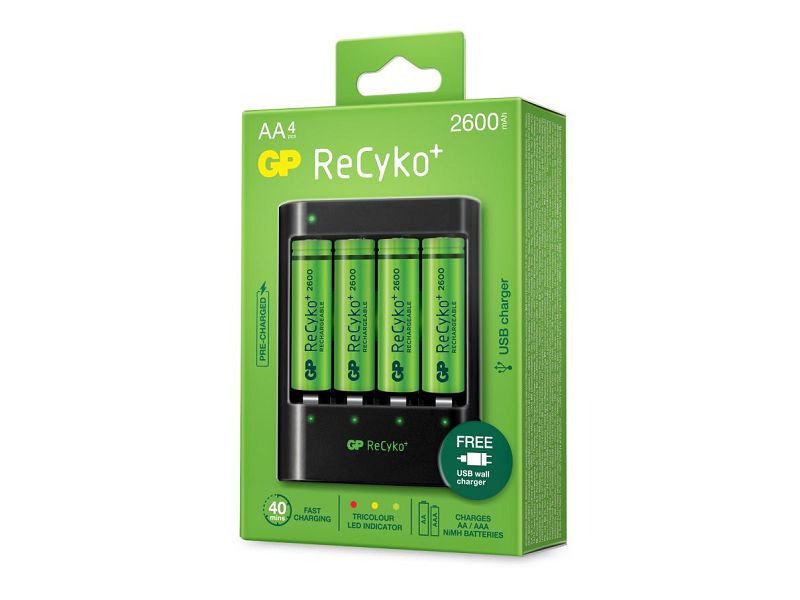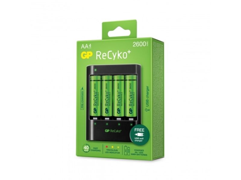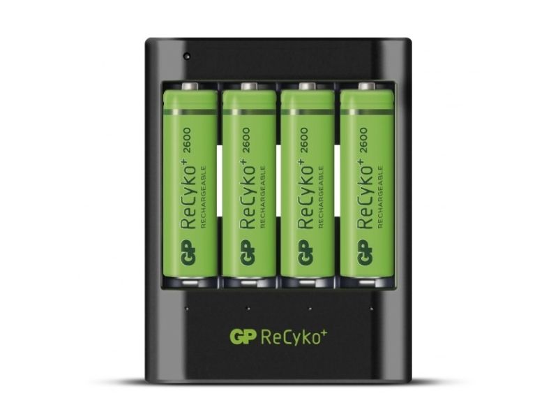 GP-batterier ReCyko+ 4 x AA oppladbare batterier 2600 mAh + hurtiglader