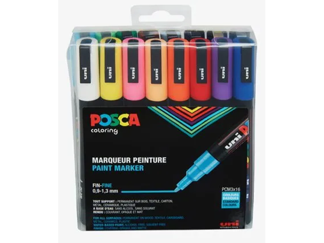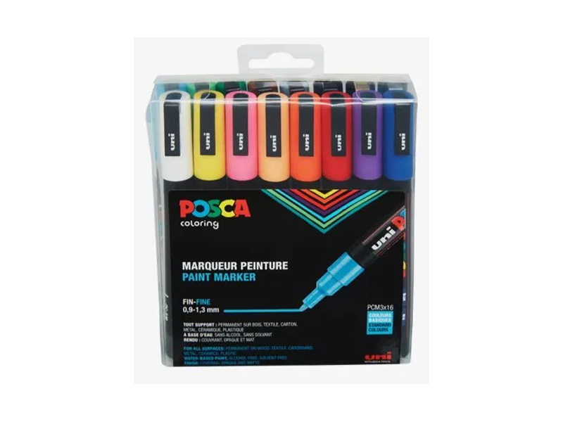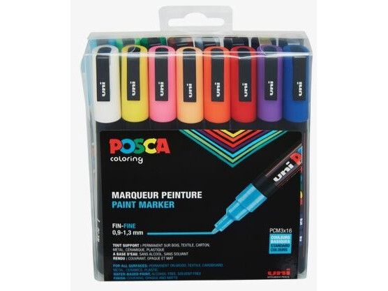 Tusch, assorterede farver, vandbaseret pigmentblæk. Den vandbaserede POSCA marker er en levende alsidig marker, der kan anvendes på mange overflader. I sættet: 16 PC-3M i standardfarver