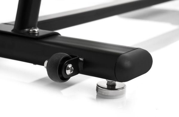 Komfortabel hjemmetrening Bred stabilisator gir stabilitet under trening. Transporthjul på frontbasen gjør det enkelt å flytte enheten innendørs. Justerbare føtter foran og bak muliggjør nøyaktig nivåjustering av sykkelen på ujevnt underlag.