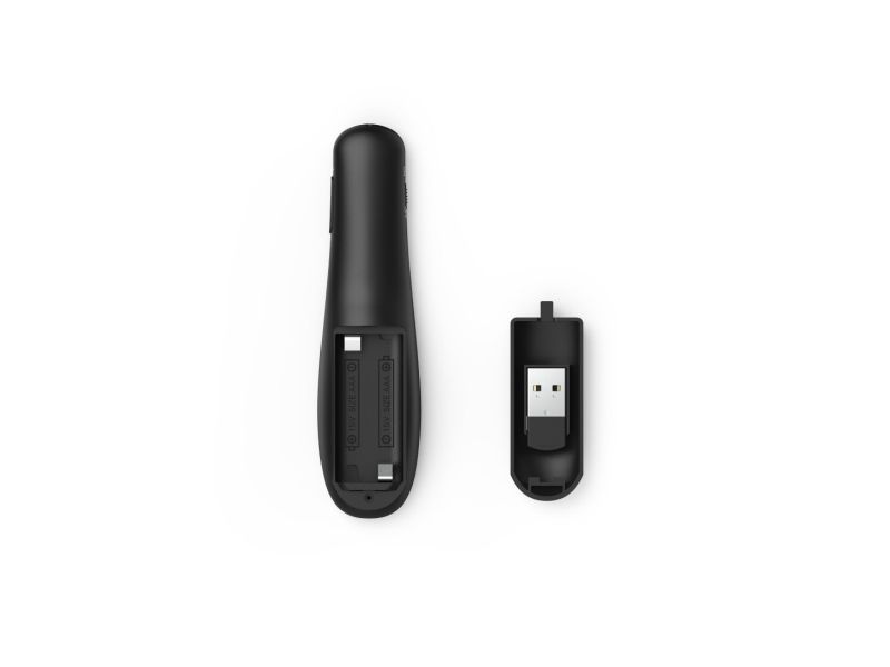 Constructed with a sturdy plastic body, this presentation remote control operates using reliable 2.4 GHz wireless technology. It connects easily to personal computers through a 4-pin USB-Type A connector, making it a convenient tool for any presenter. Additional functionalities include power on/off and scrolling to enhance the presentation experience.