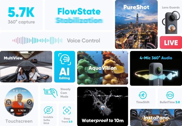 Discover an exceptional tool for creative content creation with the Insta360 One X2. This action camera transcends traditional boundaries with its 360-degree capture capability, allowing you to record and share your world in stunning spherical video and photos. Waterproof up to 10 m and equipped with electronic FlowState stabilization, the One X2 ensures your adventures are captured with clarity, whether diving into the depths or scaling heights. With a variety of shooting modes, including bullet time, time shift, and hyperlapse, your storytelling possibilities are expanded. Plus, with live streaming functionality and the ability to be controlled remotely via mobile devices, the Insta360 One X2 keeps you connected and in control, wherever your creativity leads.