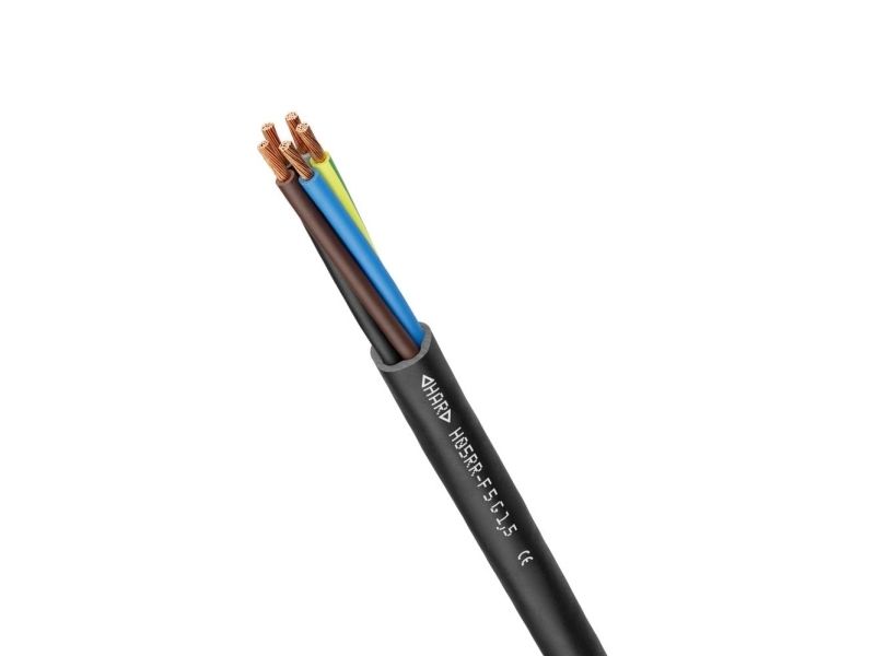 Letvægts gummi kabel til brug på håndværktøj forbindelse og lette workshop værktøjer til mild til moderat stress i tørre og fugtige rum, og midlertidigt i fri luft. konfiguration data: Fin strandede kobbertråd, kerne isolering af gummi, kerner snoet, interracial eller nummer udskriver i sort ledning ifølge VDE 0293, ydre kappe af syntetisk gummi, flammehæmmende.