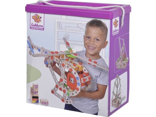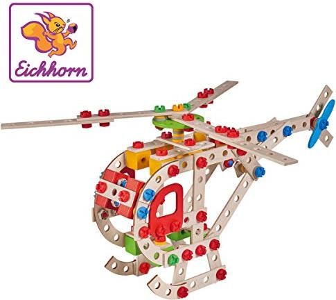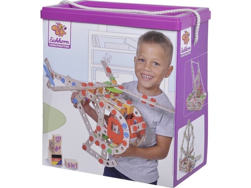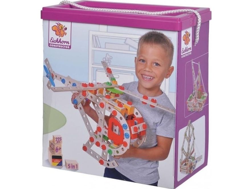 Eichhorn Constructor 225-dele. I Eichhorn CONSTRUCTOR Set i 225 dele kan der skrues fem modeller sammen: En helikopter, et kampjet, et skib, en trawler eller et vandfly. Ved hjælp af det medfølgende værktøj, vejledningen og skruerne fikseres de 225 trædele og forbindelseselementer med hinanden, og modellen opstår. Samlingen af delene fremmer og øver de spatiale evner samt finmotorikken. Eichhorn Constructor-modellerne fremstilles udelukkende af FSC® 100 % træ fra bæredygtigt skovbrug. Dette Eichhorn er fremstillet i Tyskland. Beregnet til børn fra 6 år!
