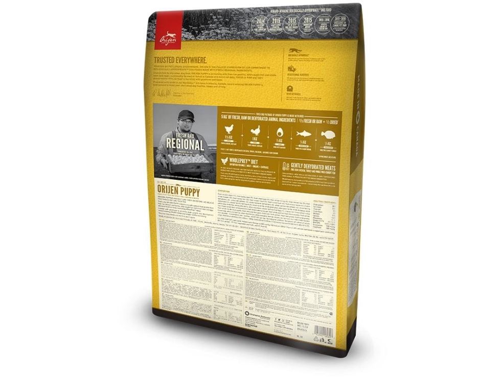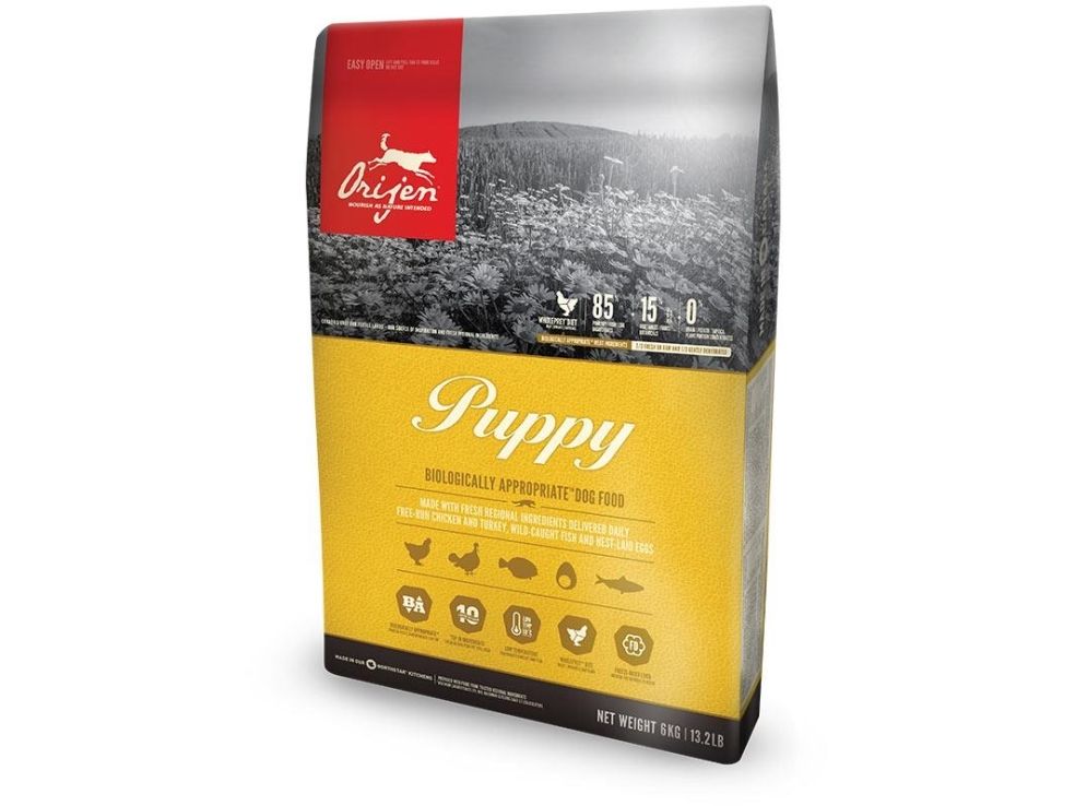 BIOLOGISK KORREKT© MAD TIL HVALPE. FRISK FRILANDS KYLLING OG KALKUN, REDELAGTE ÆG OG VILDTFANGEDE FISK. ALLE HVALPE BEHØVER EN KOST RIG PÅ PROTEIN OG FEDT FRA EN BRED VIFTE AF FRISK HEL KØD, FOR AT STYRKE OG UNDERSTØTTE DERES HASTIGE VÆKST OG UDVIKLING. Med 38% nærende proteiner, og begrænsede 17% lavt glykæmiske kulhydrater, sikrer ORIJEN at hvalpe ernæres i overensstemmelse med deres evolutionære og biologiske behov. Ulig noget andet hvalpefoder, er hele 2/3 af kødet i ORIJEN FRISK (nedkølet, ingen konserveringsmidler), eller RÅ (lynfrosset, ingen konserveringsmidler), hvilket også inkluderer de første 10 ingredienser. 1/3 af kødet er lufttørret ved 90°C, lavet af frisk kylling, kalkun og fisk, hvilket udgør koncentrerede kilder til rigt nærende proteiner der sikrer din hvalps vækst. Næringsrige WholePrey forhold af frisk kød, organer og brusk plus friske hele fisk og friske æg, udgør en naturligt stærk kilde til stort set alle næringsstoffer din hvalp behøver. Ingredienser som frysetørret kyllinge- og kalkunlever styrker smagen naturligt, og gør ORIJEN delikat selv for de mest kræsne spisere.