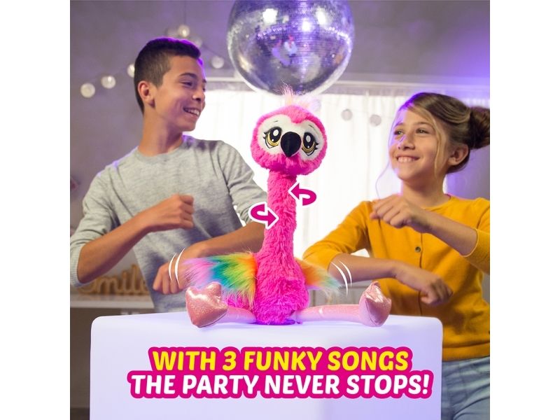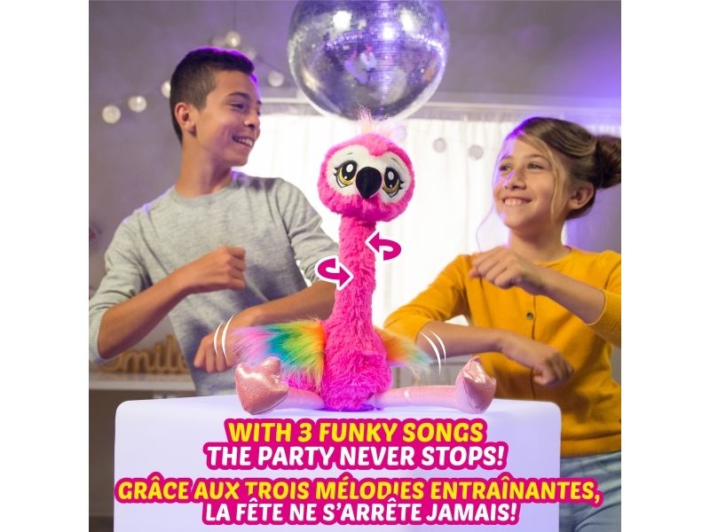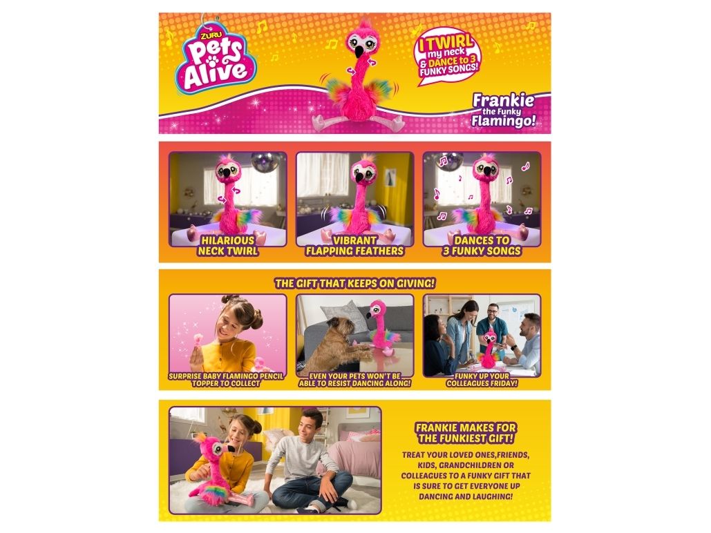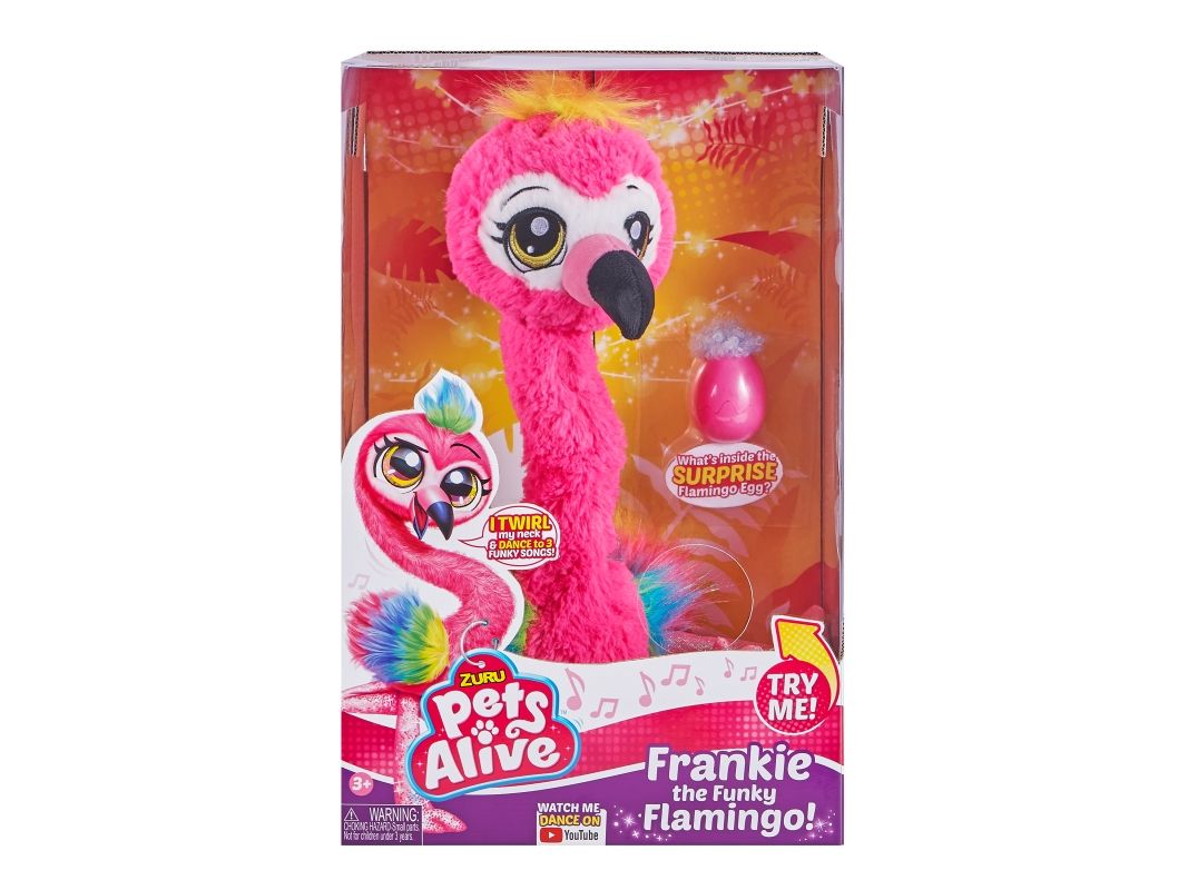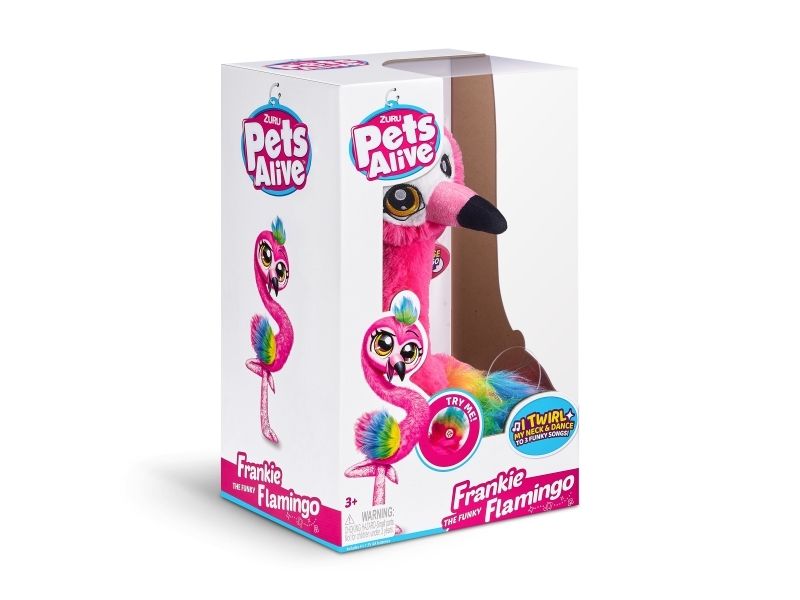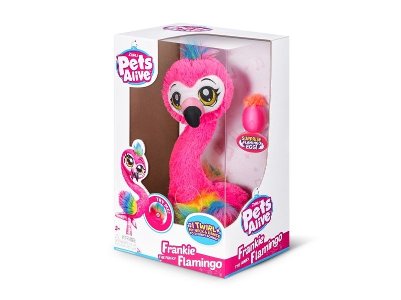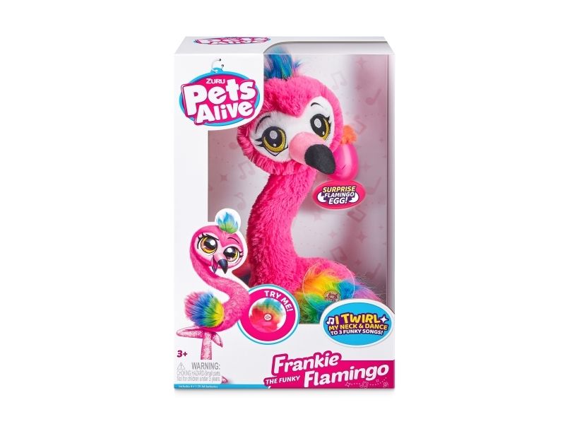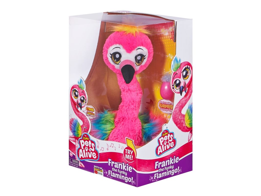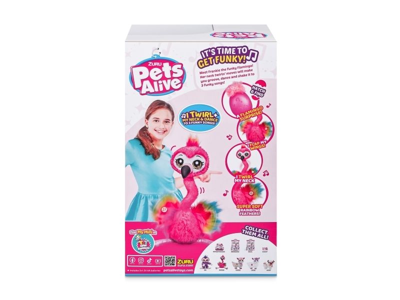 Det har aldri vært et mer funky kjæledyr enn Frankie the Funky Flamingo fra ZURU Pets Alive! Hennes morsomme nakkevridning og livlige flagrende fjær gjør det umulig å ikke reise seg og danse med! Hun danser til 3 funky sanger og kommer til og med med en babyflamingofigur å samle. Hvem har mer FUNK? Du eller Frankie?